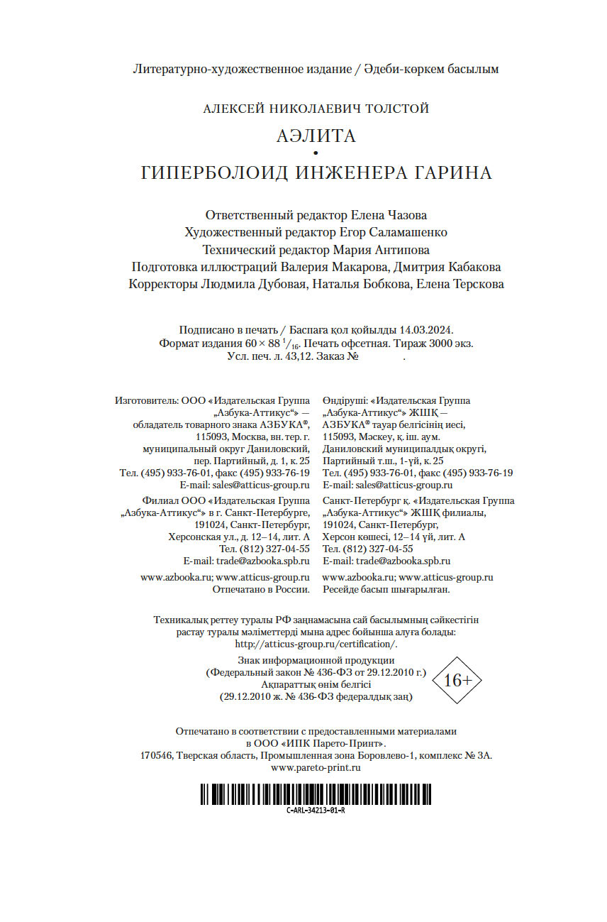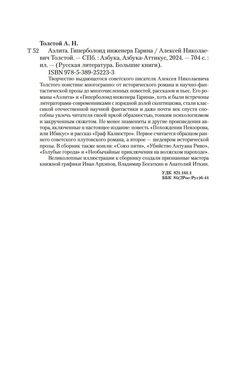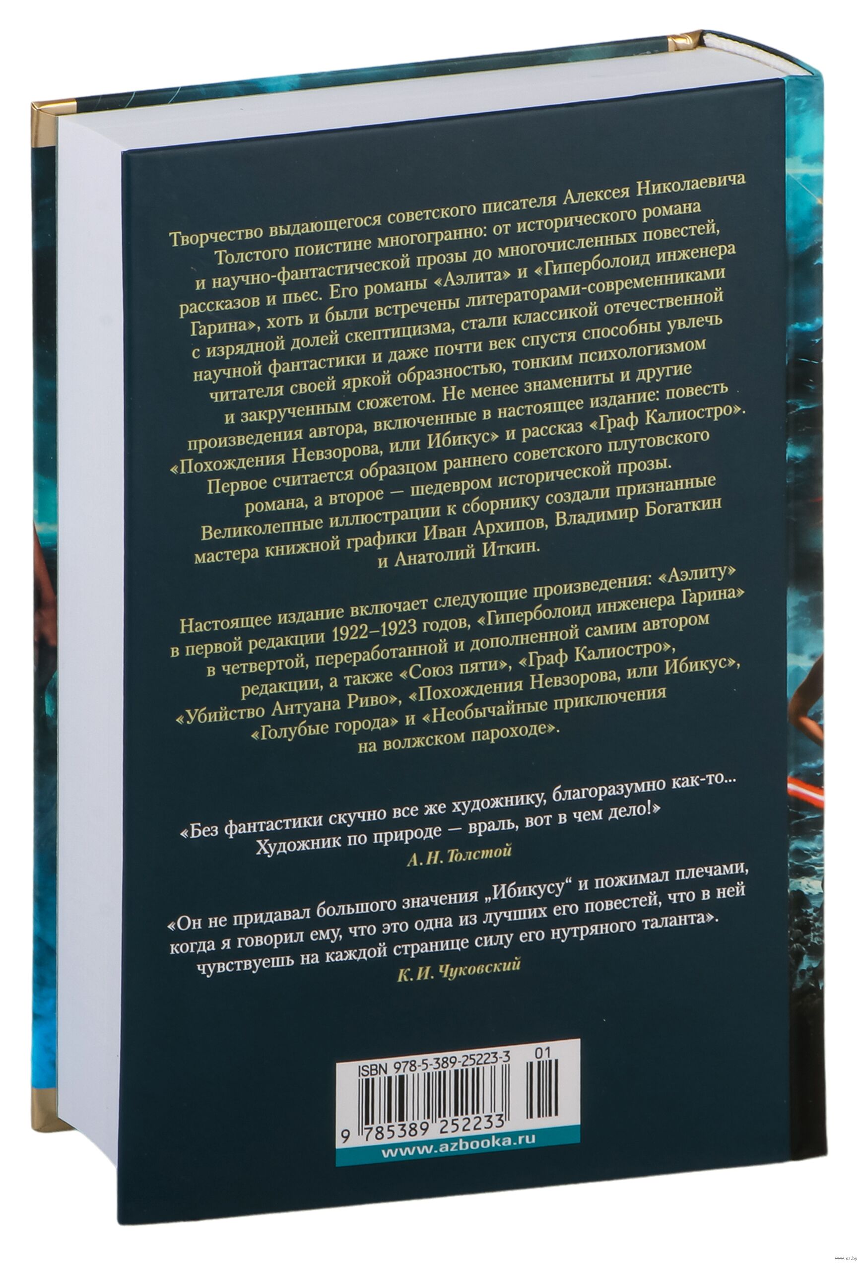 Творчество выдающегося советского писателя Алексея Николаевича Толстого поистине многогранно: от исторического романа и научно-фантастической прозы до многочисленных повестей, рассказов и пьес. Его романы "Аэлита" и "Гиперболоид инженера Гарина", хоть и были встречены литераторами-современниками с изрядной долей скептицизма, стали классикой отечественной научной фантастики и даже почти век спустя способны увлечь читателя своей яркой образностью, тонким психологизмом и закрученным сюжетом. Не менее знамениты и другие произведения автора, включенные в настоящее издание: повесть "Похождения Невзорова, или Ибикус" и рассказ "Граф Калиостро". Первое считается образцом раннего советского плутовского романа, а второе – шедевром исторической прозы. В сборник также вошли: "Союз пяти", "Убийство Антуана Риво", "Голубые города" и "Необычайные приключения на волжском пароходе".