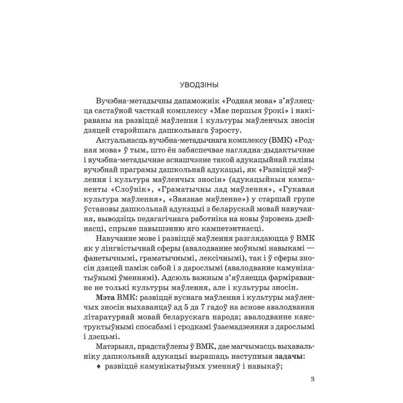 Вучэбна-метадычны дапаможнік "Родная мова" з’яўляецца часткай ВМК "Мае першыя ўрокі", уключае метадычныя парады па развіцці маўлення і культуры маўленчых зносін, прыкладныя канспекты заняткаў для выхаванцаў старшай групы (ад 5 да 7 гадоў) у адпаведнасці з задачамі адукацыйнай галіны "Развіццё маўлення і культура маўленчых зносін" вучэбнай праграмы дашкольнай адукацыі.