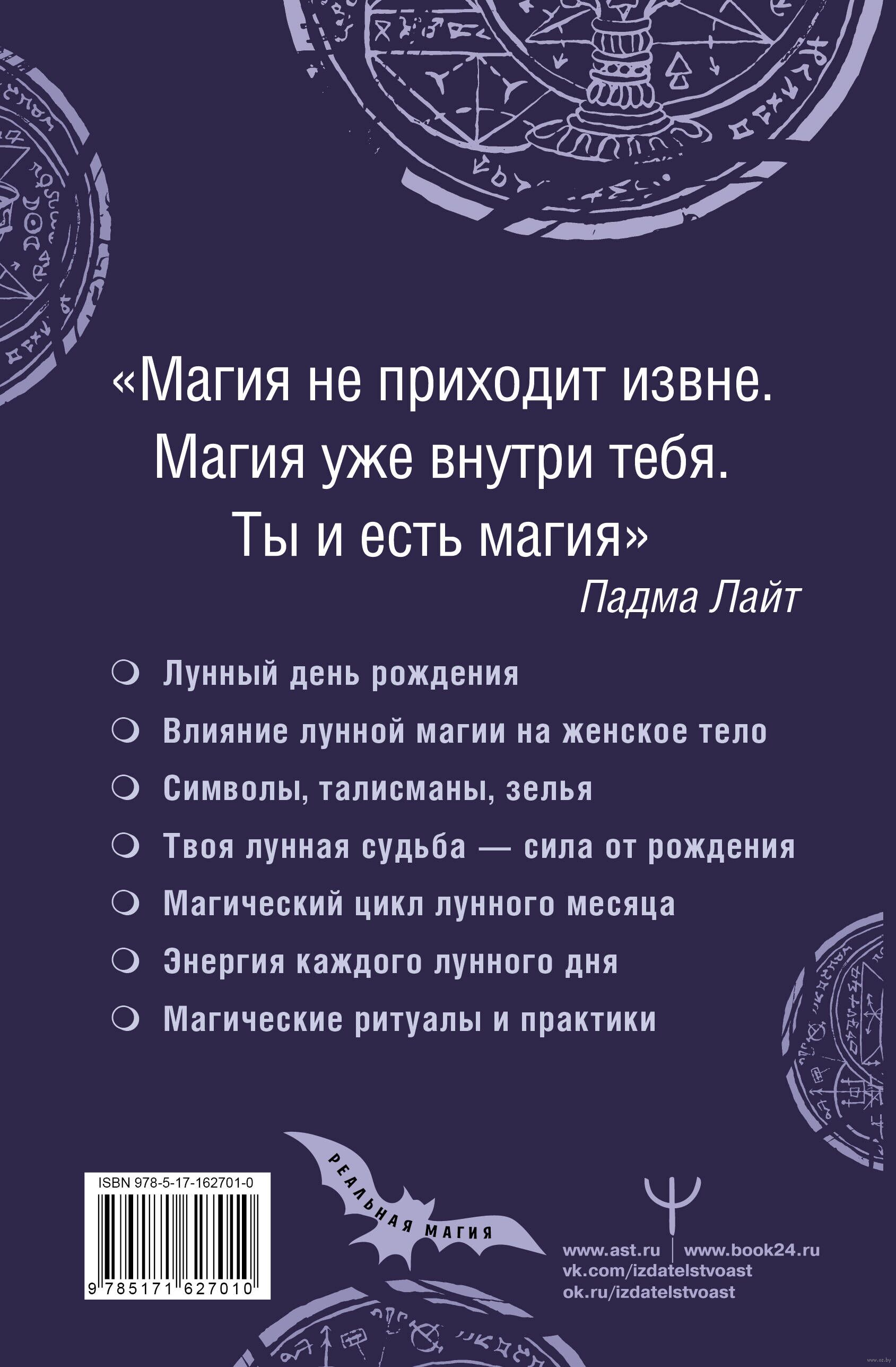 В этой книге Падма Лайт обращается к Луне, посреднику между миром людей и миром магии. В книге рассматриваются различные аспекты лунной магии, объясняется, как использовать силу лунных фаз для достижения желаемых целей. Книга содержит практические рекомендации по проведению ритуалов, медитаций и работе с энергией Луны в различные периоды ее цикла. Также здесь можно найти уникальные методики, основанные на астрологических аспектах лунных дней, которые помогут читателям гармонизировать свою жизнь и достичь внутреннего равновесия.
