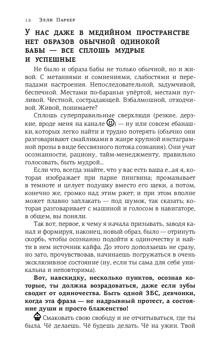 Обычная девушка, до которой не от хорошей жизни, но всё же дошло, что только всласть побыв одной и разобравшись в себе, есть шанс обрести счастье – тот его личный сорт, который подходит именно тебе. Построить и личную, и публичную, и приличную жизнь.