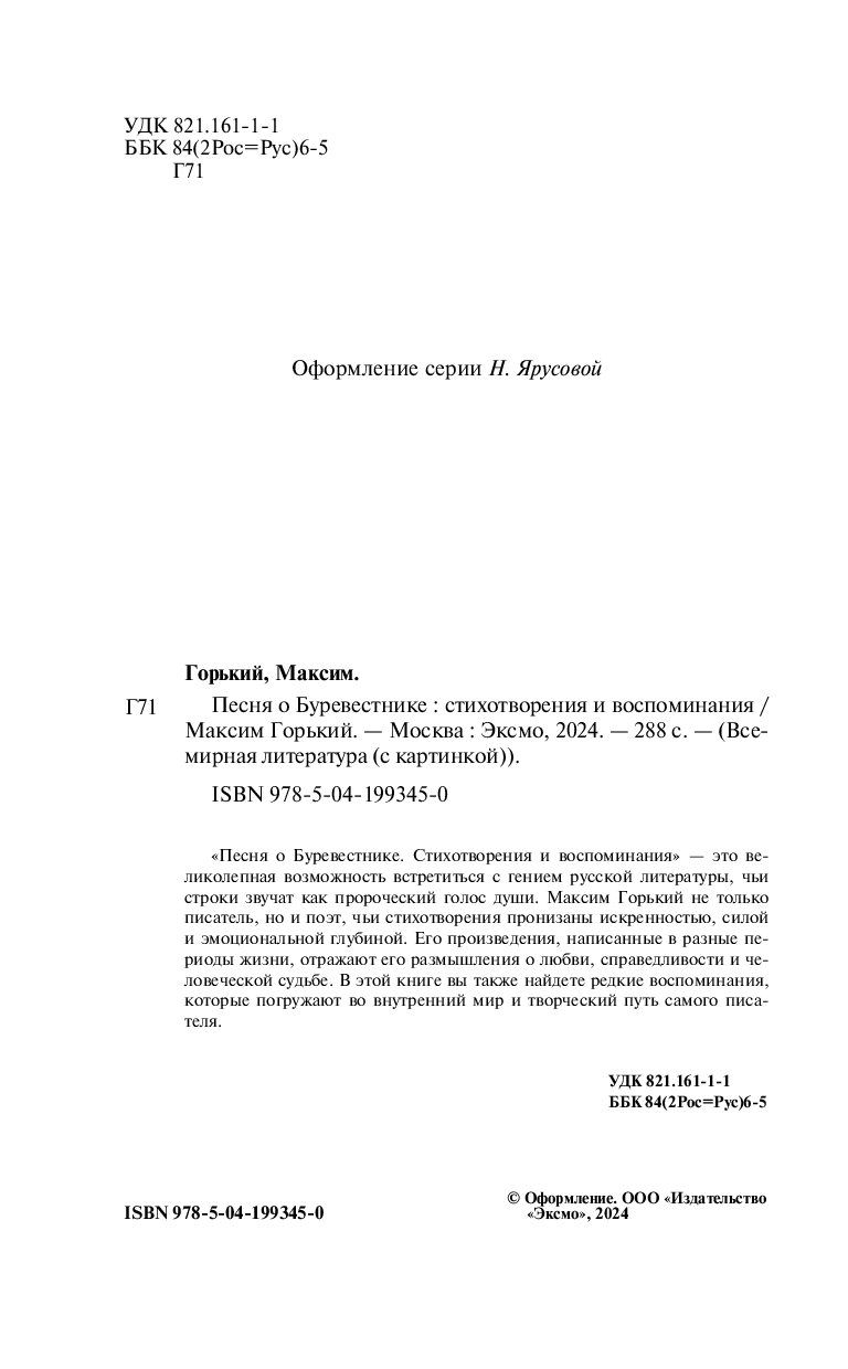 "Песня о Буревестнике. Стихотворения и воспоминания" – это великолепная возможность встретиться с гением русской литературы, чьи строки звучат как пророческий голос души. Максим Горький не только писатель, но и поэт, чьи стихотворения пронизаны искренностью, силой и эмоциональной глубиной. Его произведения, написанные в разные периоды жизни, отражают его размышления о любви, справедливости и человеческой судьбе. В этой книге вы также найдете редкие воспоминания, которые погружают во внутренний мир и творческий путь самого писателя.