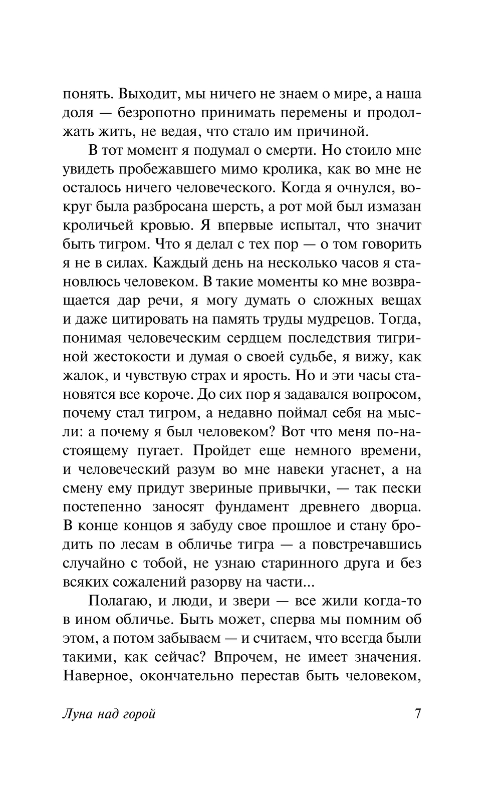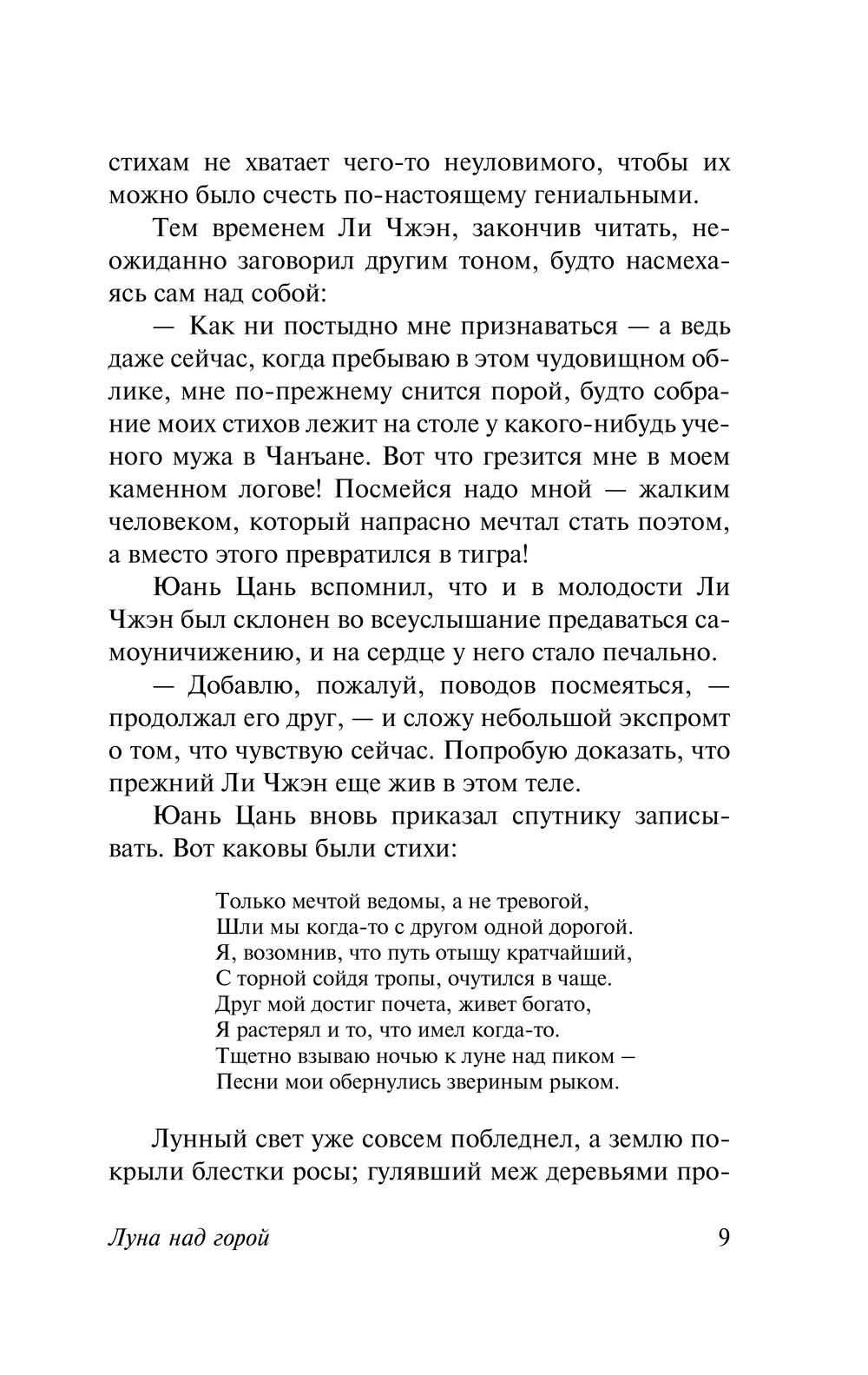 В состав сборника "Луна над горой" вошли девять рассказов, в которых китайские сказания, легенды и притчи переплетаются с японской мудростью и легкой иронией самого автора. Среди героев его историй – мифические создания, великие воины и почтенные мастера, которые оказываются в крайне необычных для себя обстоятельствах. Охотник встречает тигра, который обращается к нему голосом его пропавшего друга, сановник делает своим помощником человека-быка, а демон, терзаемый сомнениями и угрызениями совести, ищет смысл жизни.