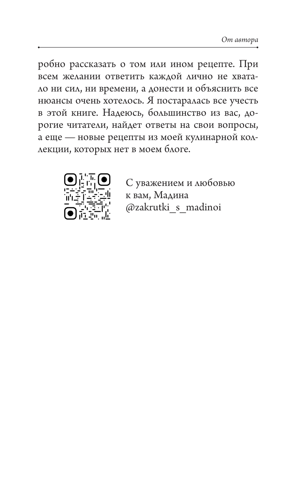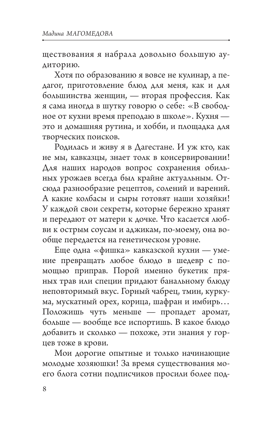 Вы узнаете все о правилах заготовки закруток, научитесь делать самые вкусные соленья, маринады соусы и многое другое. Ведомые чуткой и опытной рукой Мадины, вы не столкнетесь с нежизнеспособными рецептами, неправильными пропорциями и тем более с плохим вкусом! Эта книга состоит только из проверенных фирменных рецептов, при помощи которых получится сохранить уникальный вкус летних овощей.