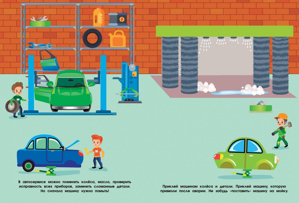 Вместе с героями книжки ты сможешь побывать в автосервисе, на заправке, на парковке и в гараже. Играй, придумывай свои истории и приклеивай машинки. С многоразовыми наклейками будет вдвойне интересно!