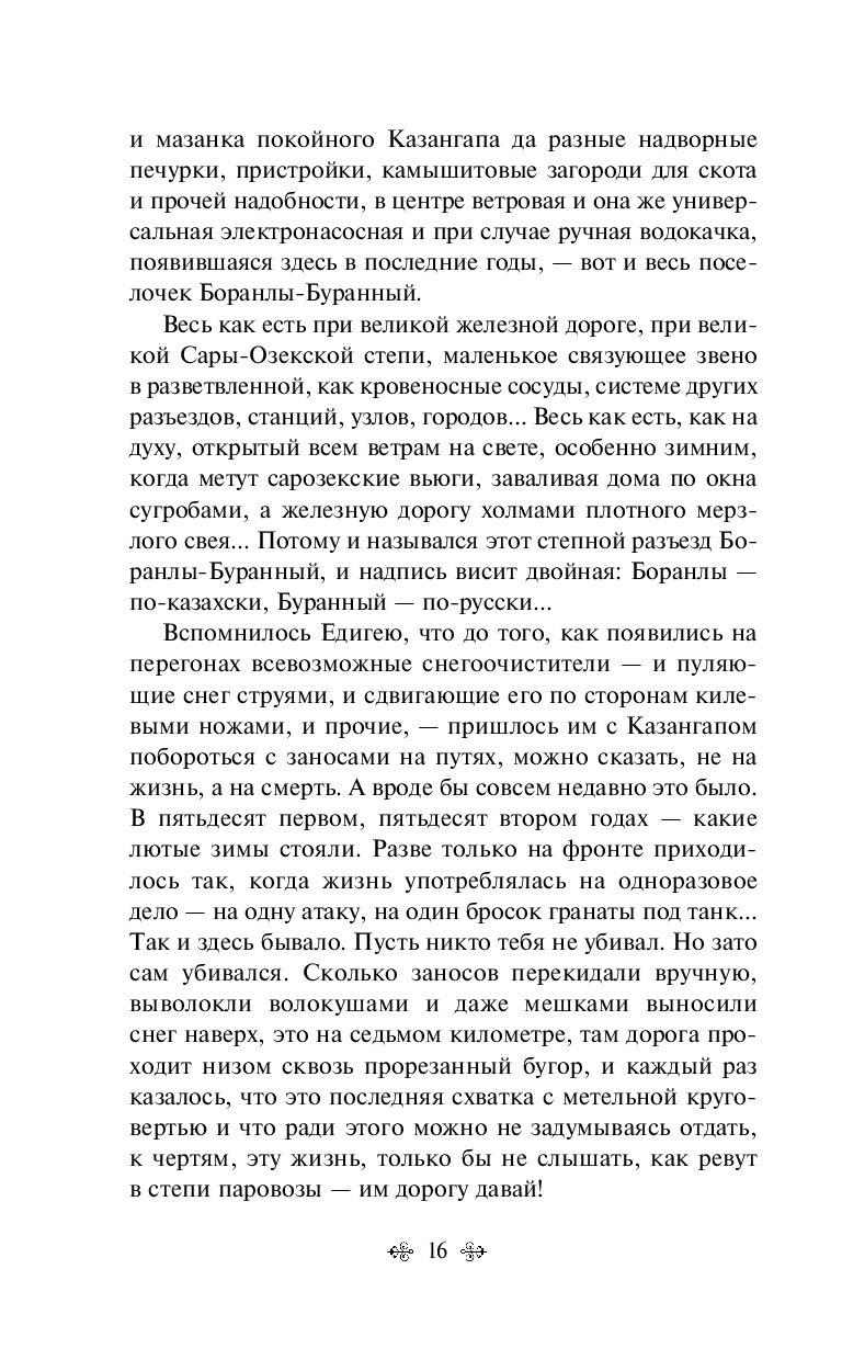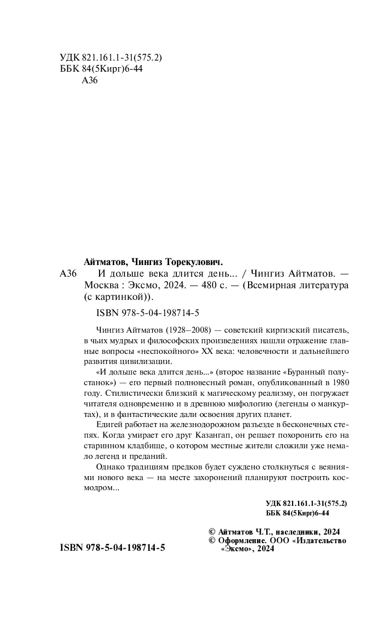 "И дольше века длится день..." (второе название "Буранный полустанок") – его первый полновесный роман, опубликованный в 1980 году. Стилистически близкий к магическому реализму, он погружает читателя одновременно и в древнюю мифологию (легенды о манкуртах), и в фантастические дали освоения других планет.