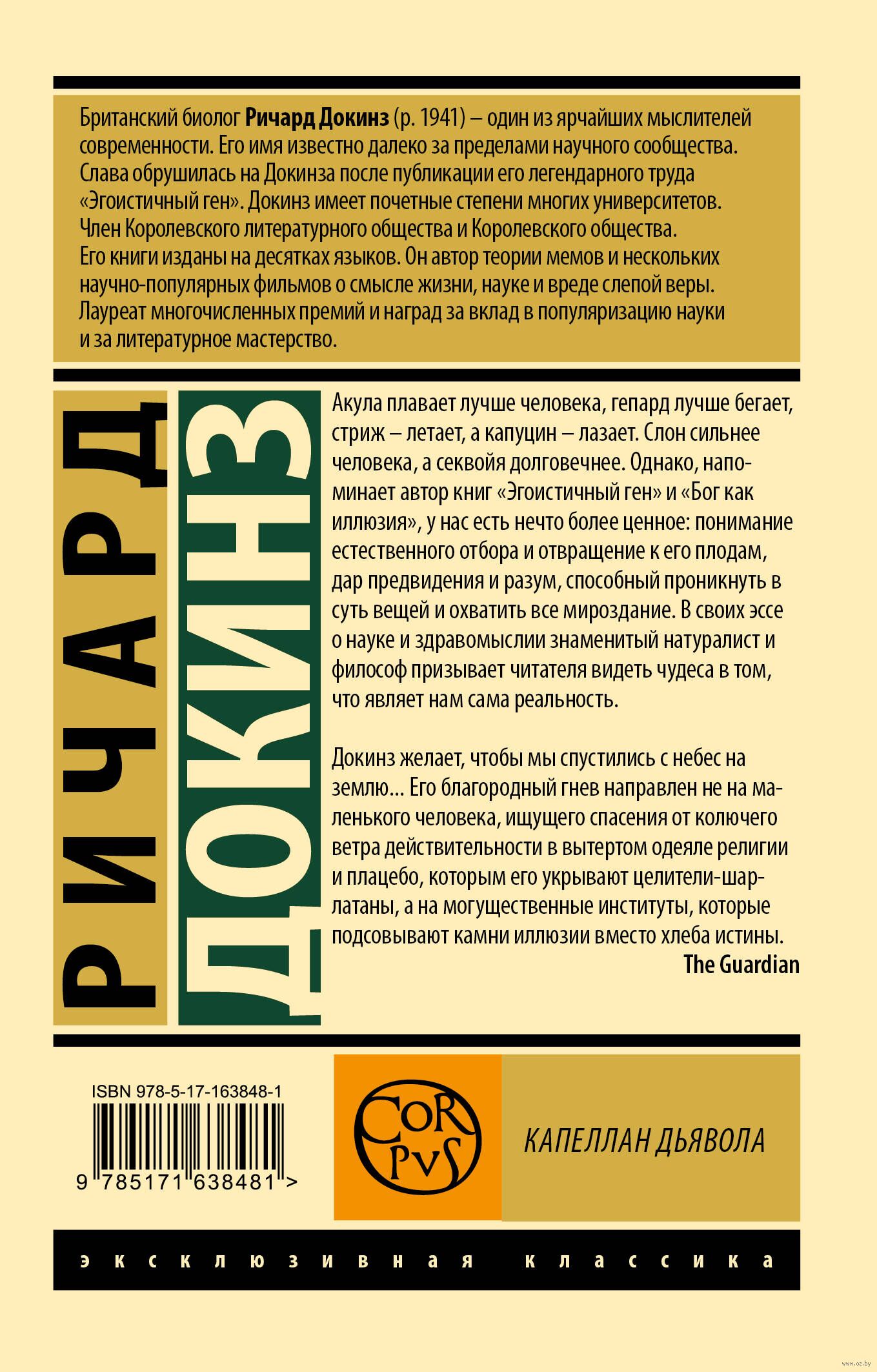 Акула плавает лучше человека, гепард лучше бегает, стриж лучше его летает, а капуцин – лазает. Слон сильнее человека, а секвойя – долговечнее. Однако, напоминает автор книг "Эгоистичный ген" и "Бог как иллюзия", у нас есть нечто гораздо более ценное: понимание естественного отбора и отвращение к его плодам, дар предвидения и разум, способный проникнуть в суть вещей и охватить все мироздание. В своих эссе о науке, религии и здравомыслии знаменитый натуралист и философ призывает читателя оставить иллюзии и видеть чудеса в том, что являет нам сама реальность.