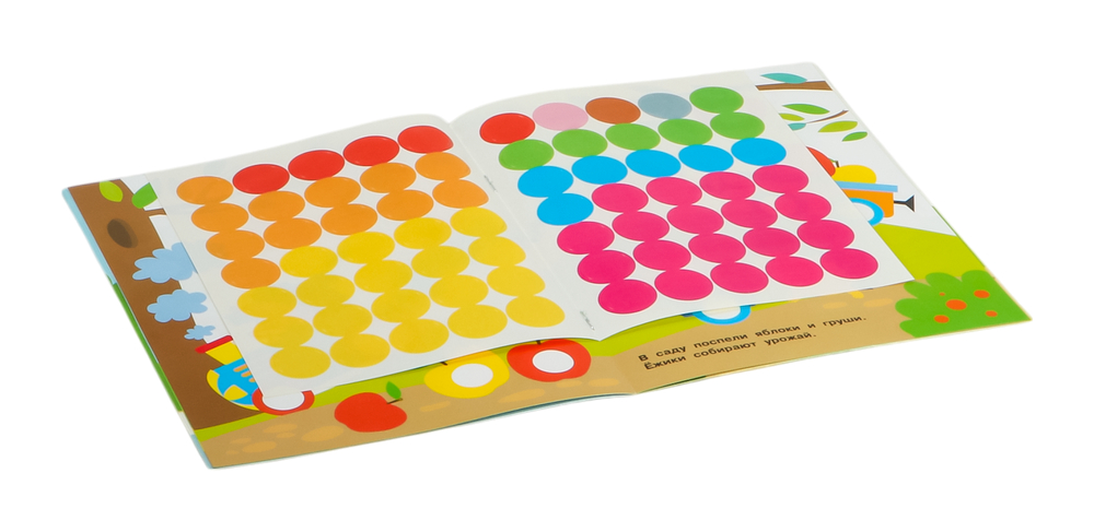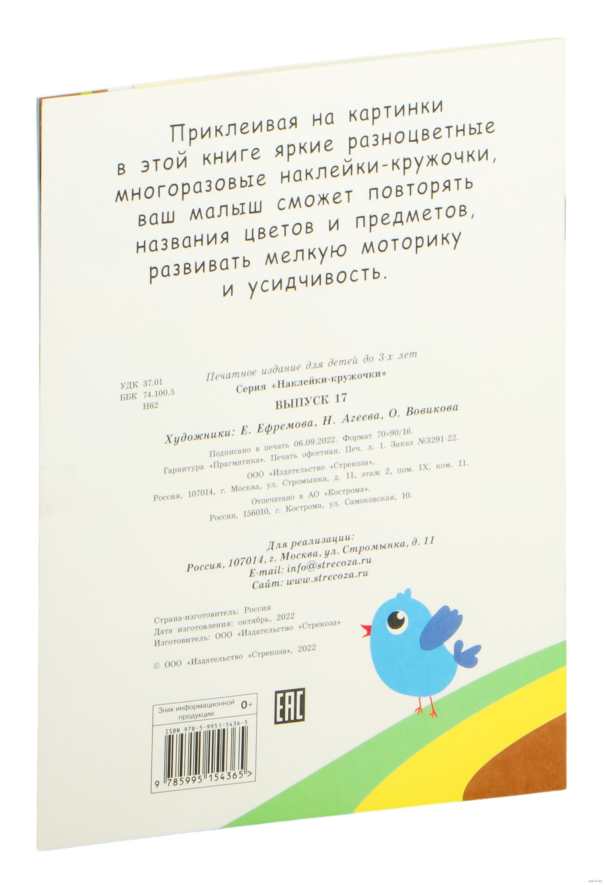 Приклеивая на картинки в этой книге яркие разноцветные многоразовые наклейки – кружочки, ваш малыш сможет повторять названия цветов и предметов, развивать мелкую моторику и усидчивость.
