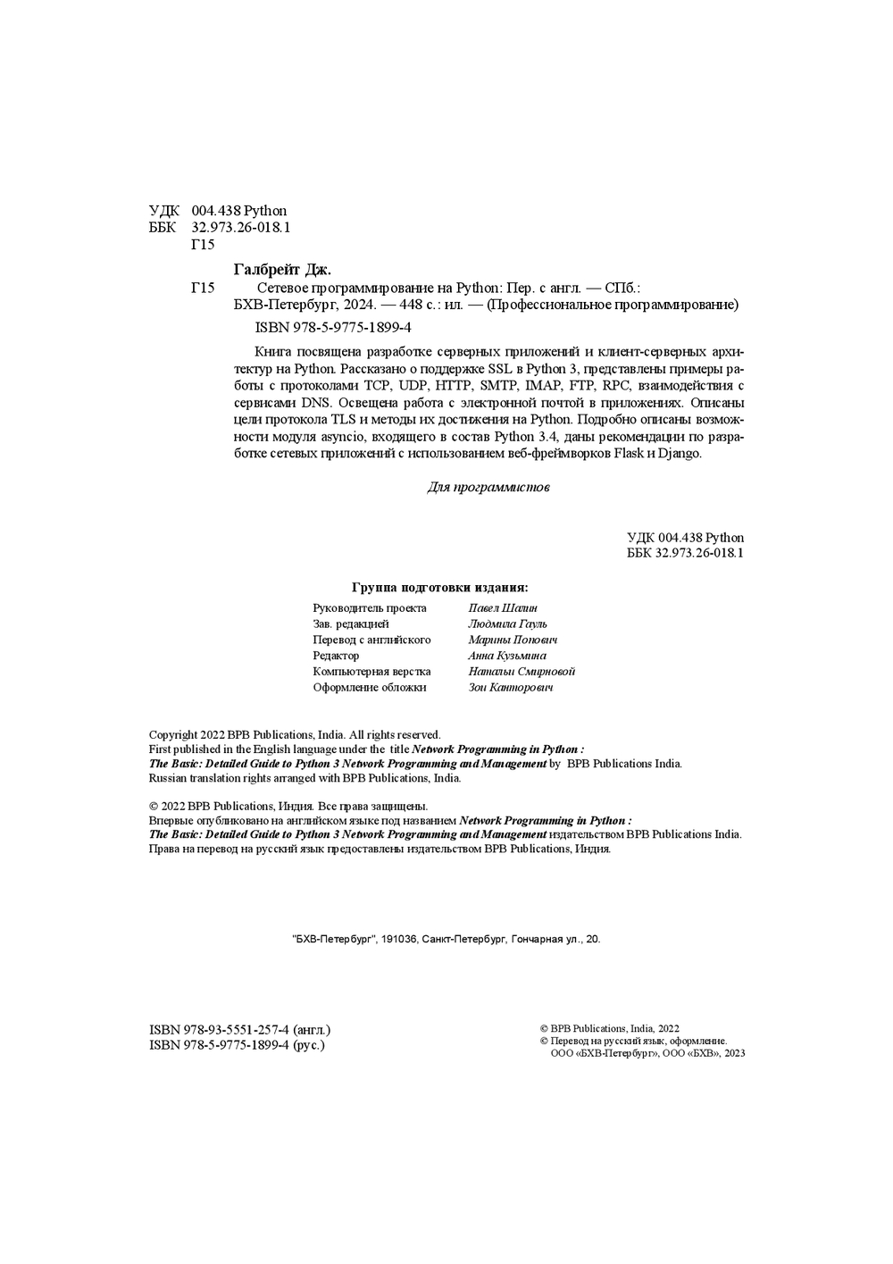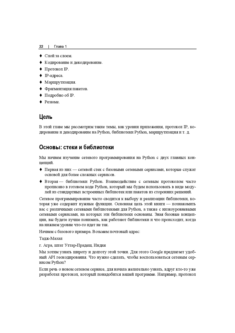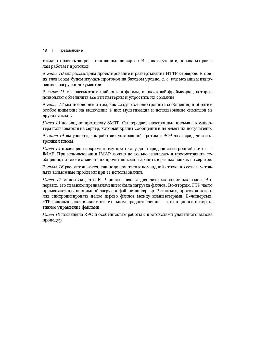 Книга посвящена разработке серверных приложений и клиент-серверных архитектур на Python. Рассказано о поддержке SSL в Python 3, представлены примеры работы с протоколами TCP, UDP, HTTP, SMTP, IMAP, FTP, RPC, взаимодействия с сервисами DNS. Освещена работа с электронной почтой в приложениях. Описаны цели протокола TLS и методы их достижения на Python. Подробно описаны возможности модуля asyncio, входящего в состав Python 3.4, даны рекомендации по разработке сетевых приложений с использованием веб-фреймворков Flask и Django.
