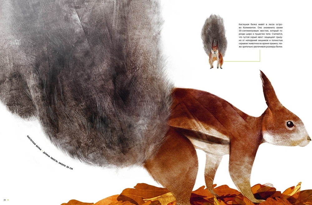 Какой длины язык у малайского медведя? Чем питается карликовая многозубка? Где обитает лягушка-голиаф? На страницах этой книги ты можешь увидеть самых удивительных и необычных животных нашей планеты: сероголовую летучую лисицу, жабу-агу, паука-скакуна, кистеухую белку и многих других. Рассмотри зубы белой акулы, хвост шестиполосой ящерицы-бегуна, коготь каймановой черепахи. Большинство рисунков выполнено в натуральную величину!