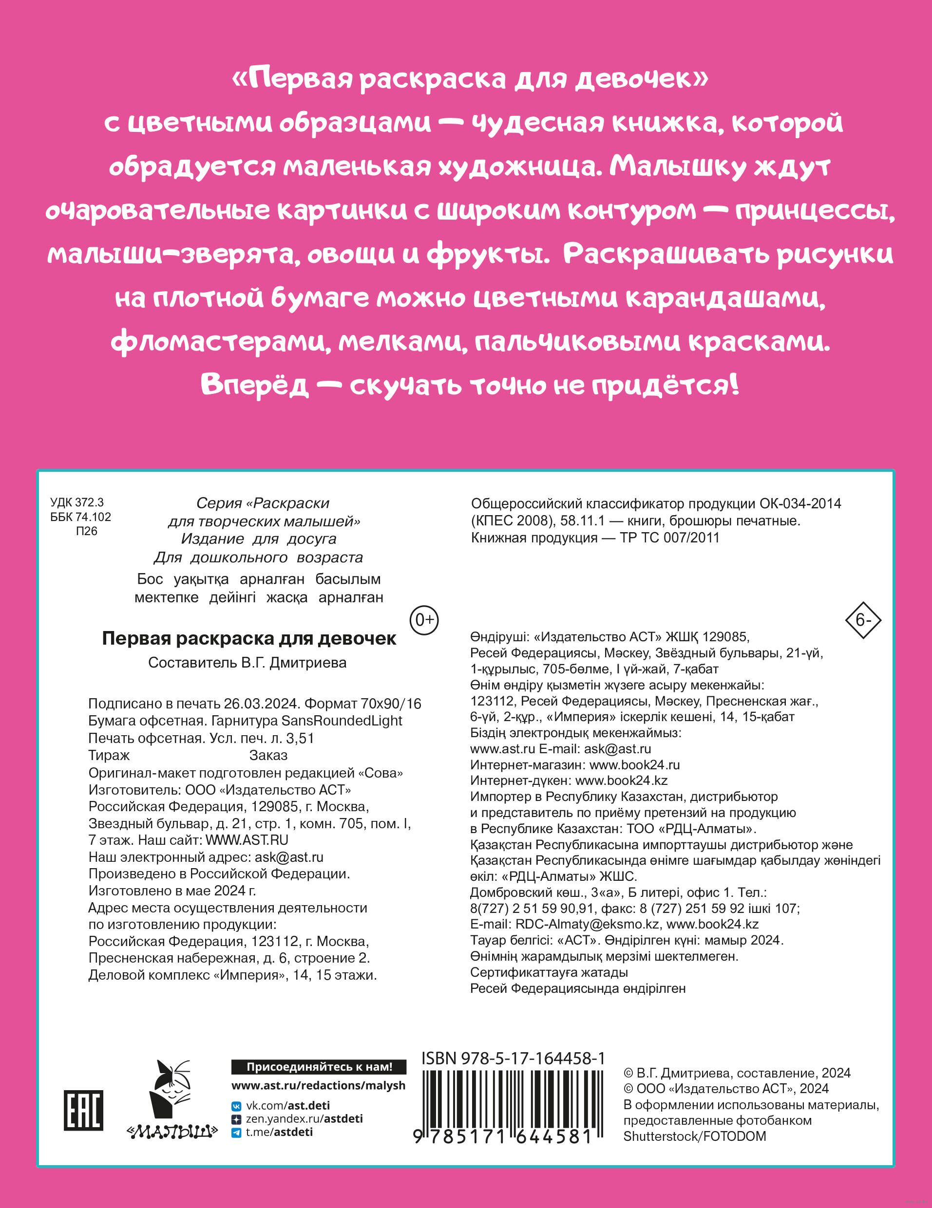 "Первая раскраска для девочек" с цветными образцами – то, что нужно малышке, которая только учится рисовать. 48 страниц творческого веселья: крупные картинки с принцессами, животными, фруктами и овощами. Рисунки с толстым контуром, их легко и приятно раскрашивать. Плотная, качественная бумага. Все иллюстрации подписаны.