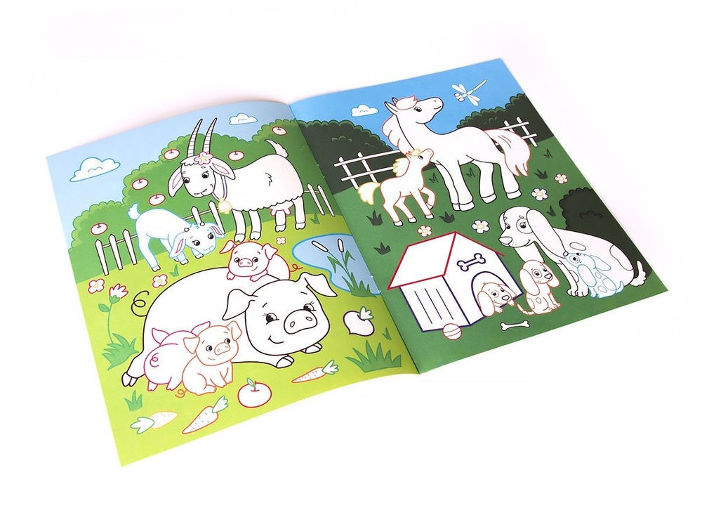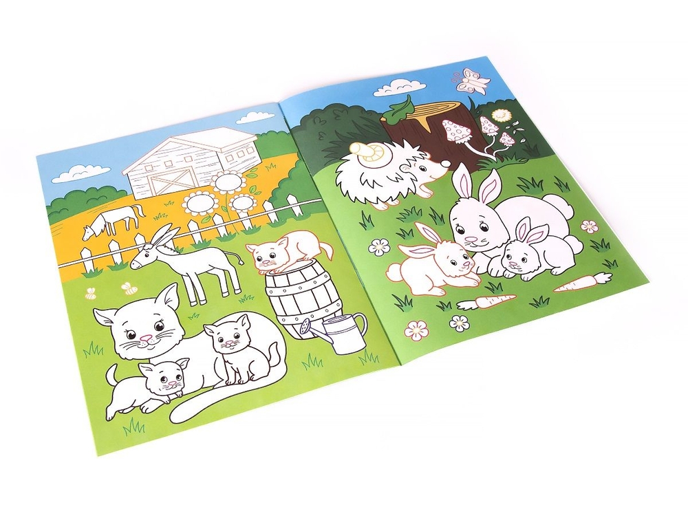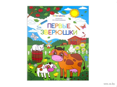 Раскраска для самых маленьких "Первые зверюшки" изготовлена из плотной бумаги. Все рисунки выполнены широким разноцветным контуром, расположены на цветном фоне.