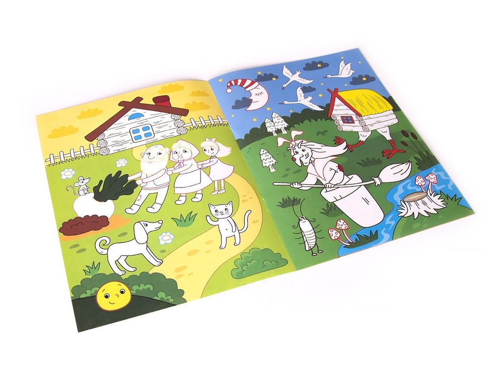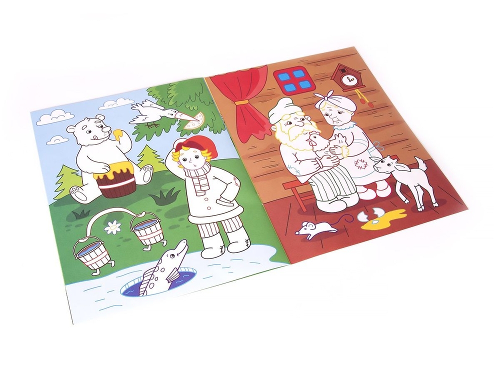 Раскраска для самых маленьких "Первые сказки" изготовлена из плотной бумаги. Все рисунки выполнены широким разноцветным контуром, расположены на цветном фоне.