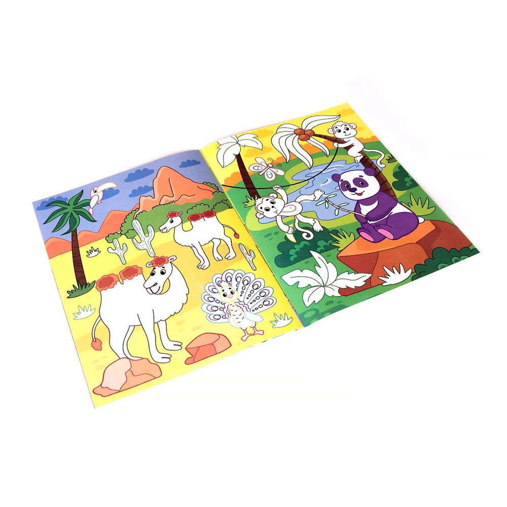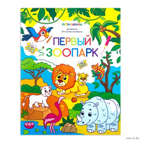 Раскраска для самых маленьких "Первый зоопарк" изготовлена из плотной бумаги. Все рисунки выполнены широким разноцветным контуром, расположены на цветном фоне.