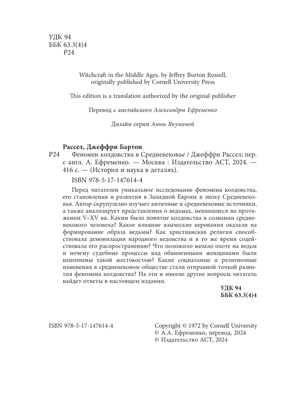 Перед читателем уникальное исследование феномена колдовства, его становления и развития в Западной Европе в эпоху Средневековья. Автор скрупулезно изучает античные и средневековые источники, а также анализирует представления о ведьмах, менявшиеся на протяжении V-XV вв. Каким было понятие колдовства в сознании средневекового человека? Какое влияние языческие верования оказали на формирование образа ведьмы? Как христианская религия способствовала демонизации народного ведовства и в то же время содействовала его распространению? Что положило начало охоте на ведьм и почему судебные процессы над обвиненными женщинами были наполнены такой жестокостью? Какие социальные и религиозные изменения в средневековом обществе стали отправной точкой развития феномена колдовства? На эти и многие другие вопросы читатель найдет ответы в настоящем издании.