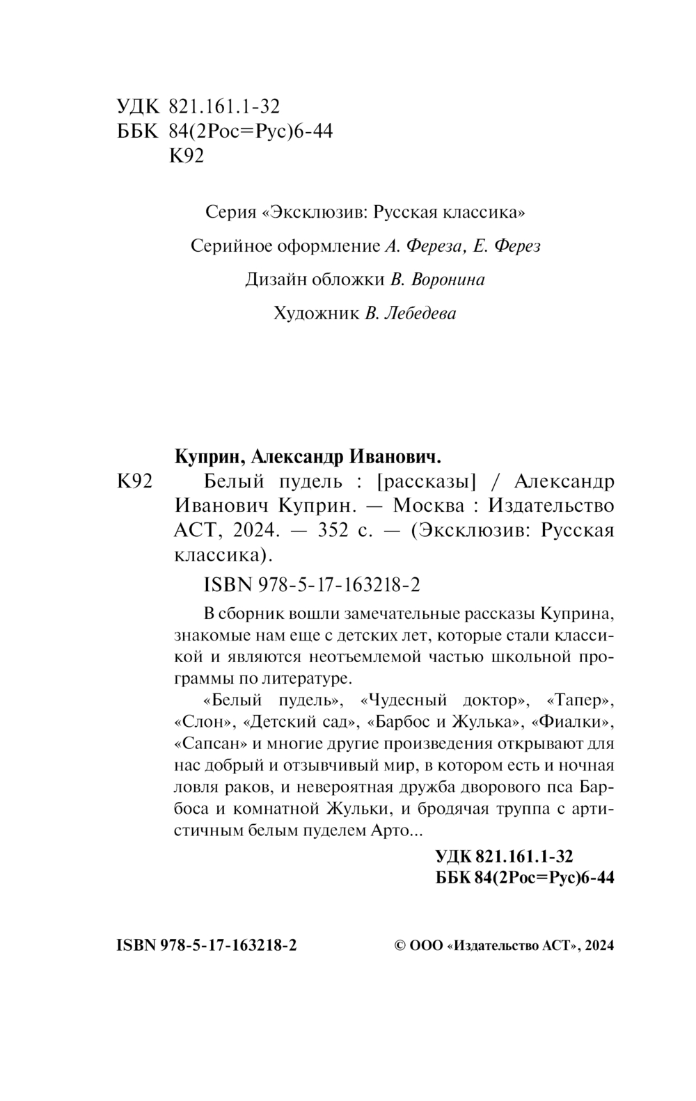"Белый пудель", "Чудесный доктор", "Тапер", "Слон", "Детский сад", "Барбос и Жулька", "Фиалки", "Сапсан" и многие другие произведения открывают для нас добрый и отзывчивый мир, в котором есть и ночная ловля раков, и невероятная дружба дворового пса Барбоса и комнатной Жульки, и бродячая труппа с артистичным белым пуделем Арто...