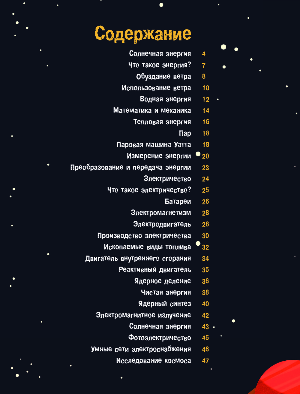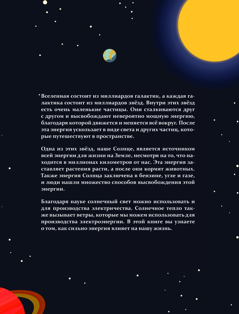 Эта книга познакомит читателя с тем, как работает абсолютно всё на нашей планете: от ветряной мельницы и парусных кораблей до атомных электростанций. Что такое энергия? Какой она бывает? Как энергия помогает людям разрабатывать новые технологии и как влияет на нашу жизнь? Книга ответит на все эти вопросы, а также поможет узнать, как человек осваивал различные виды энергии: от открытия огня и до полётов в космос.