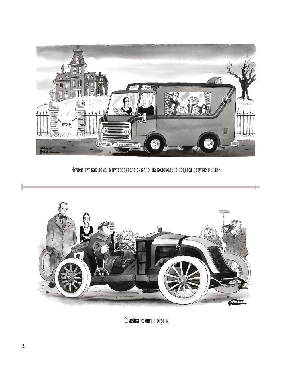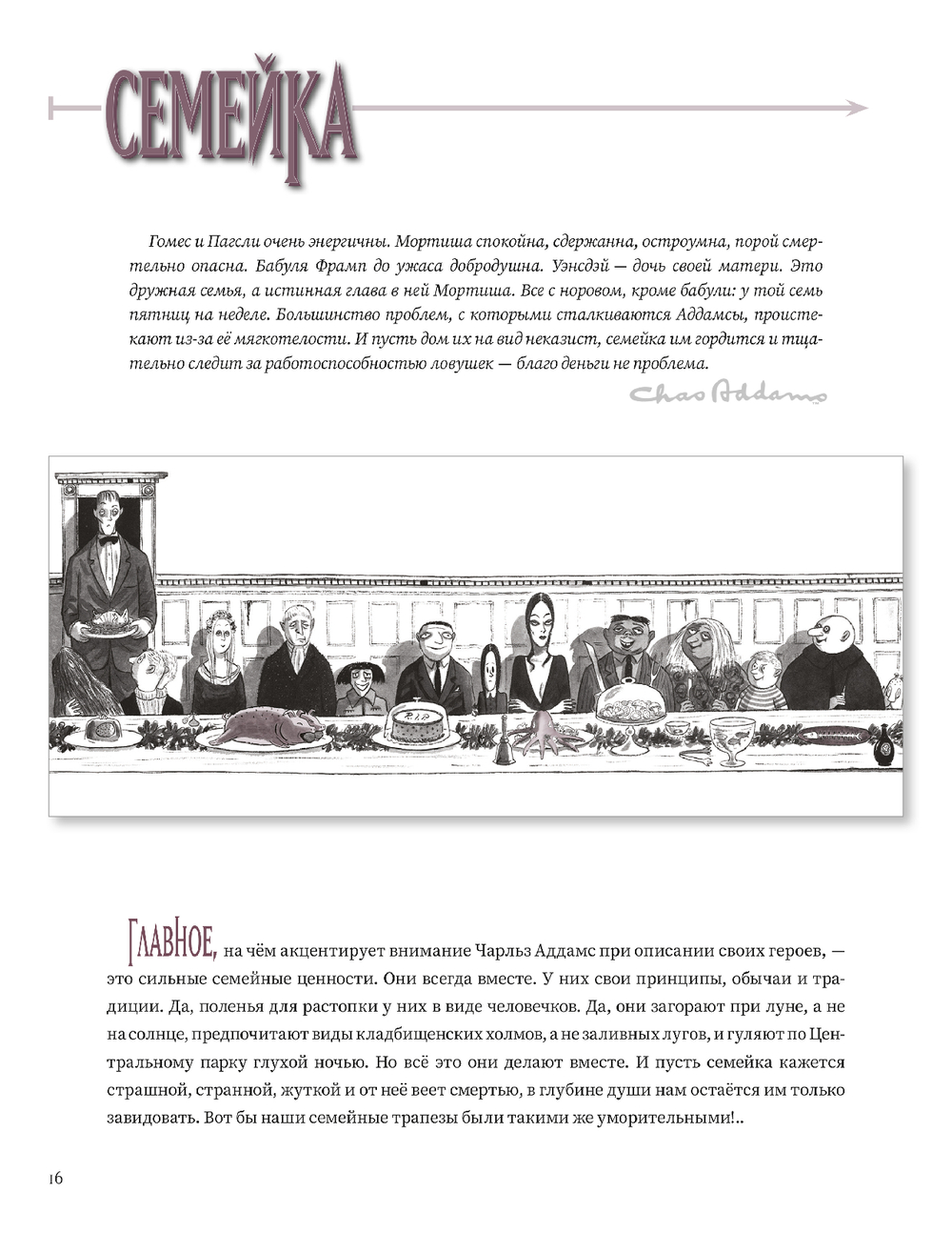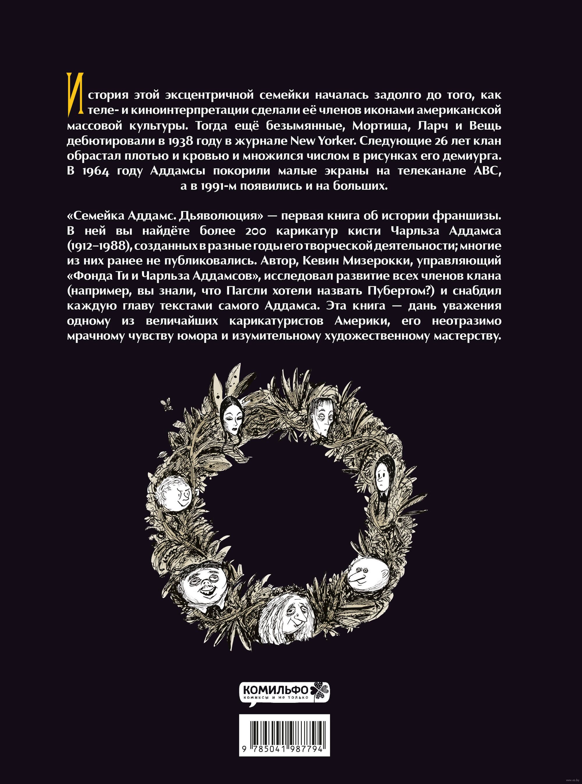 "Семейка Аддамс. Дьяволюция" – первая книга об истории франшизы. В ней вы найдёте более 200 карикатур кисти Чарльза Аддамса (1912-1988), созданных в разные годы его творческой деятельности; многие из них ранее не публиковались. Автор, Кевин Мизерокки, управляющий "Фонда Ти и Чарльза Аддамсов", исследовал развитие всех членов клана (например, вы знали, что Пагсли хотели назвать Пубертом?) и снабдил каждую главу текстами самого Аддамса. Эта книга – дань уважения одному из величайших карикатуристов Америки, его неотразимо мрачному чувству юмора и изумительному художественному мастерству.