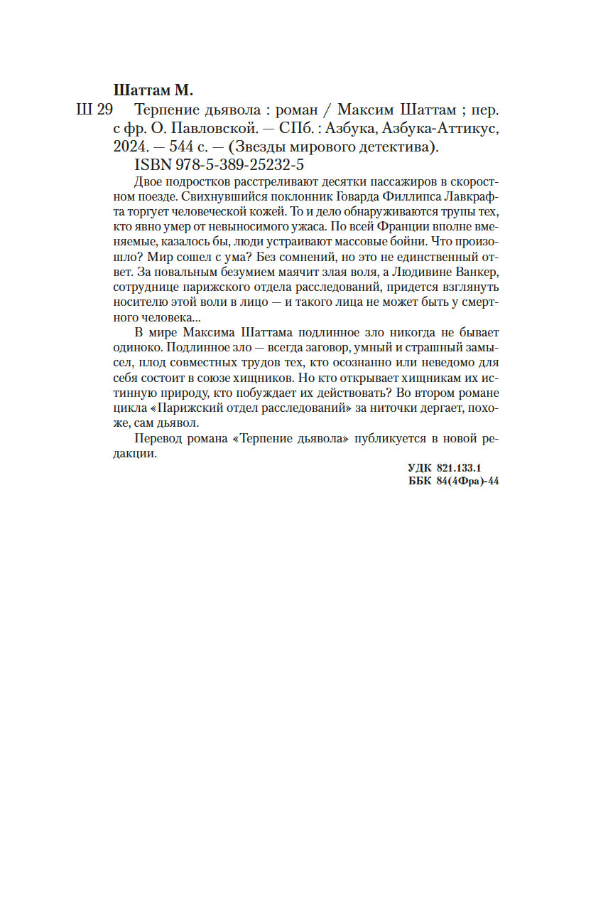 В мире Максима Шаттама подлинное зло никогда не бывает одиноко. Подлинное зло – всегда заговор, умный и страшный замысел, плод совместных трудов тех, кто осознанно или неведомо для себя состоит в союзе хищников. Но кто открывает хищникам их истинную природу, кто побуждает их действовать? Во втором романе цикла "Парижский отдел расследований" за ниточки дергает, похоже, сам дьявол.