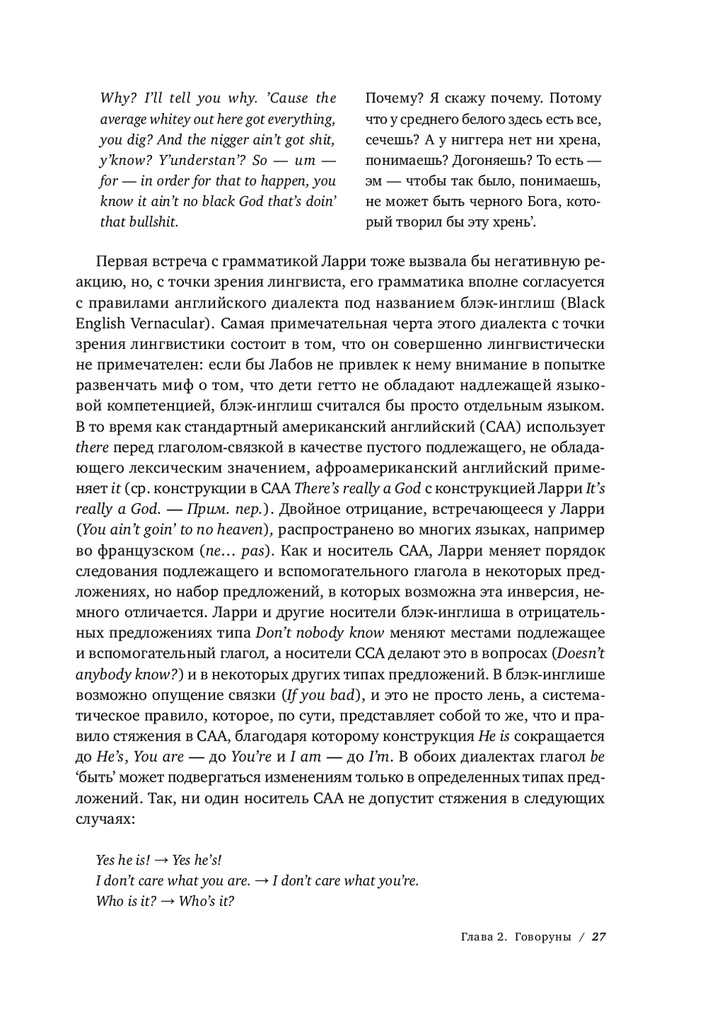 Огромный круг проблем, поднимаемых автором, не оставляет равнодушным никого, кто пользуется языком. В чем суть языка? Как он устроен? Разрушают ли его слова, проникающие в нашу жизнь с каждым новым поколением? Как связаны язык и мышление? Эти и многие другие вопросы, рассматриваемые Пинкером в книге, часто задавались и отрабатывались в ходе его лекций, ставших для публики знаковыми. Занимательные примеры из современного английского, в том числе поэзии, песен, сленга, делают повествование легким и живым.