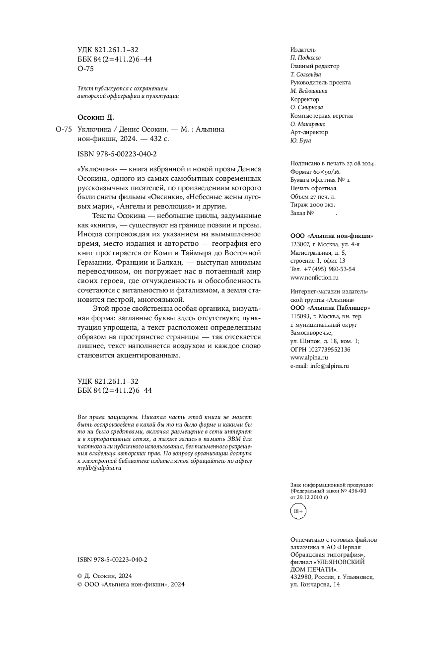 Новая и лучшая проза Дениса Осокина – яркого прозаика, чьи рассказы "Овсянки", "Небесные жёны луговых мари", "Ангелы и революция" были экранизированы. Это удивительная, совершенно самобытная проза, которая творит собственную мифологию. Осокин ничего не воспринимает как данность, он постоянно занимается смыслопорождением: новые связи между привычными словами создают совершенно новый, зачастую неожиданный эффект.