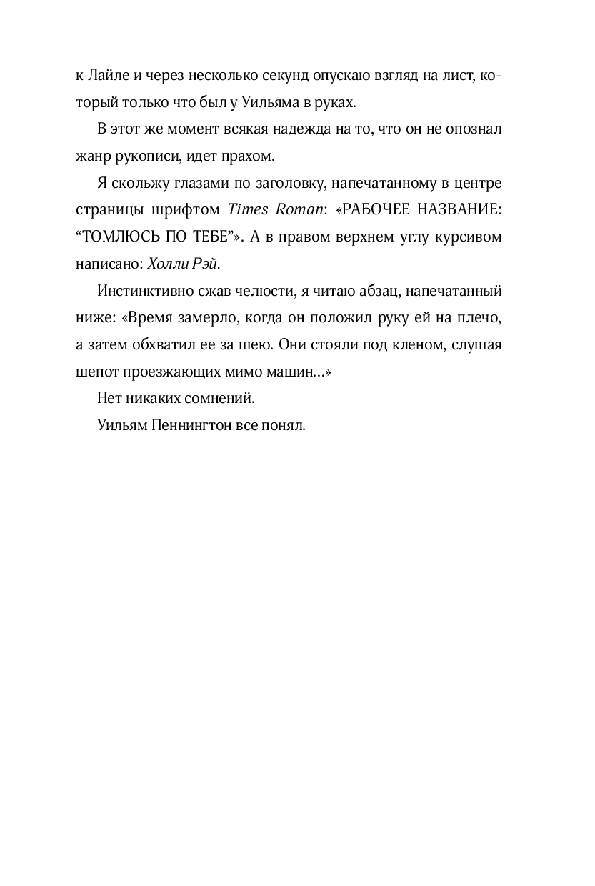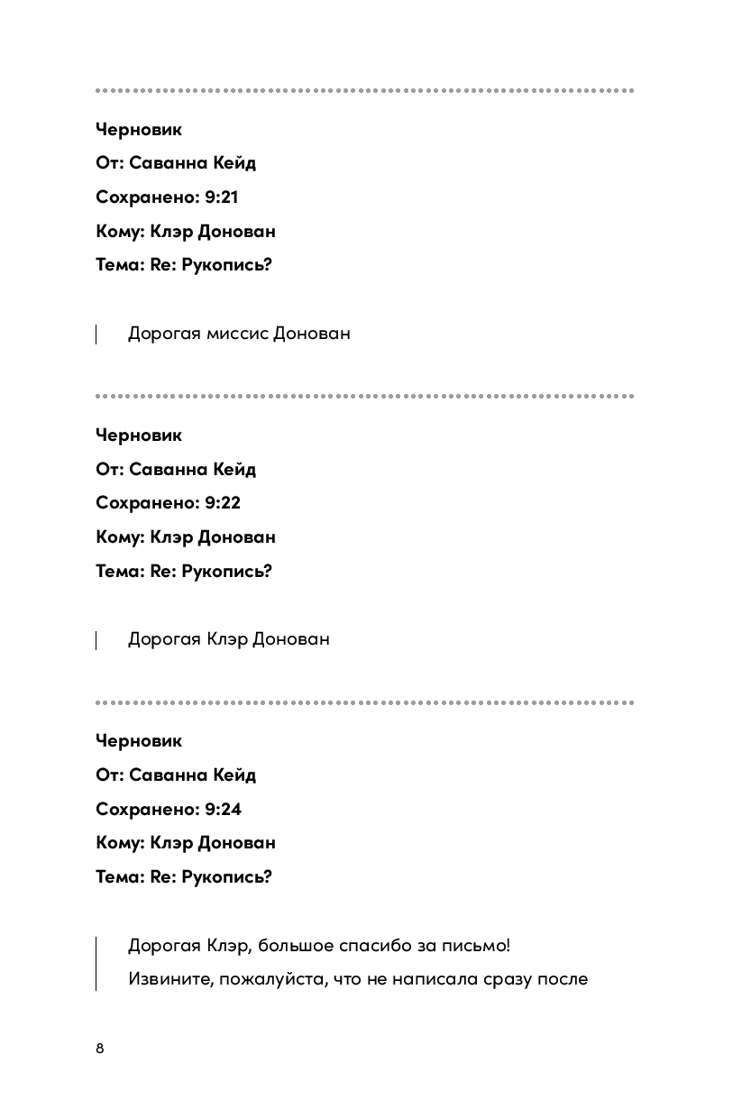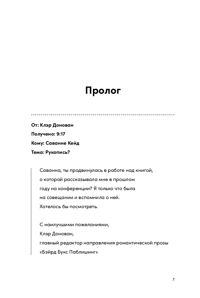 Помощь таинственного редактора оказывается очень кстати. Они обмениваются заметками на полях, и с каждым днем он нравится Саванне все больше. Работа над книгой подходит к концу, осталось только написать сцену поцелуя...