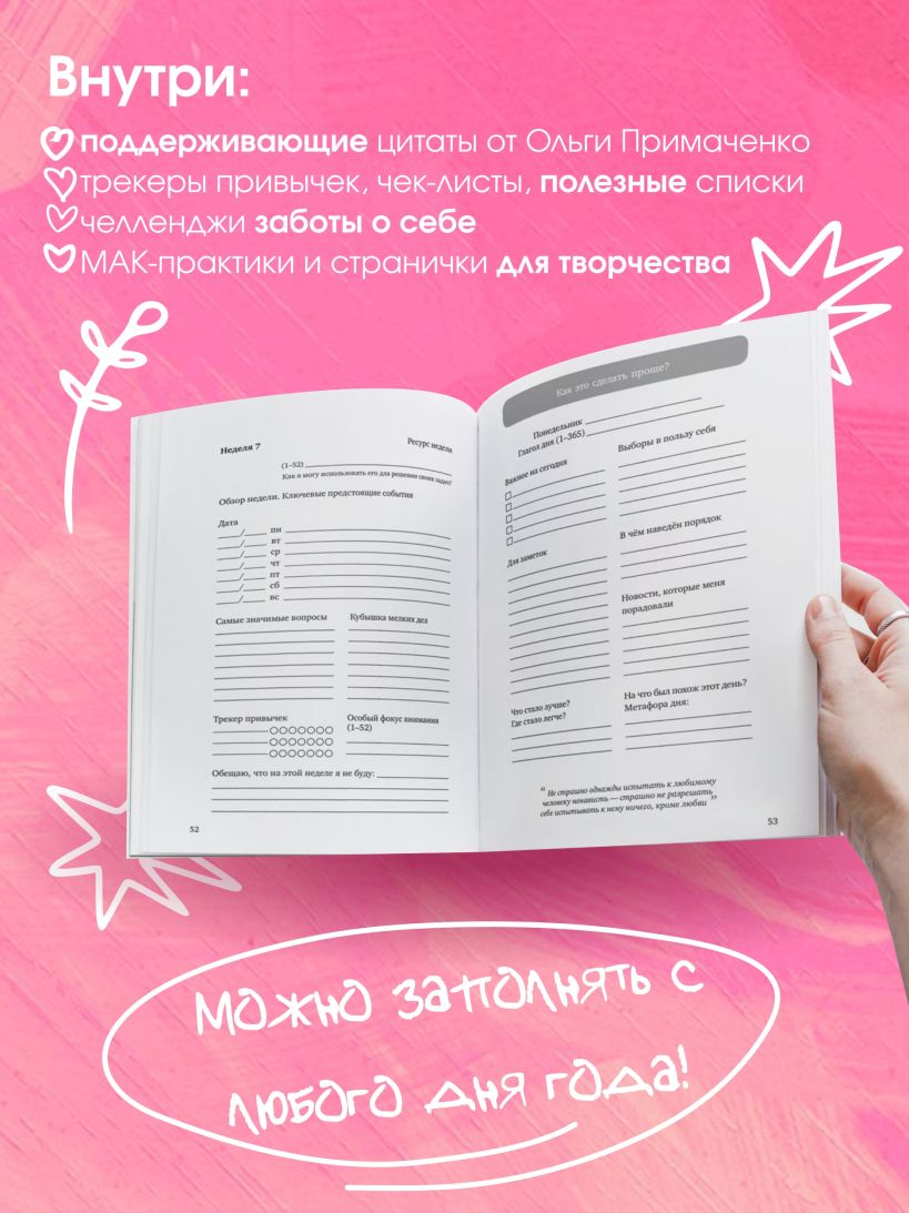 А еще вас ожидают 52 бонусные страницы с интересными практиками (в том числе с метафорическими ассоциативными картами), памятками, упражнениями, списками литературы, чек-листами, иллюстрациями для раскрашивания, колесом баланса и множеством других классных штук для исследования себя, развлечения и вдохновения!