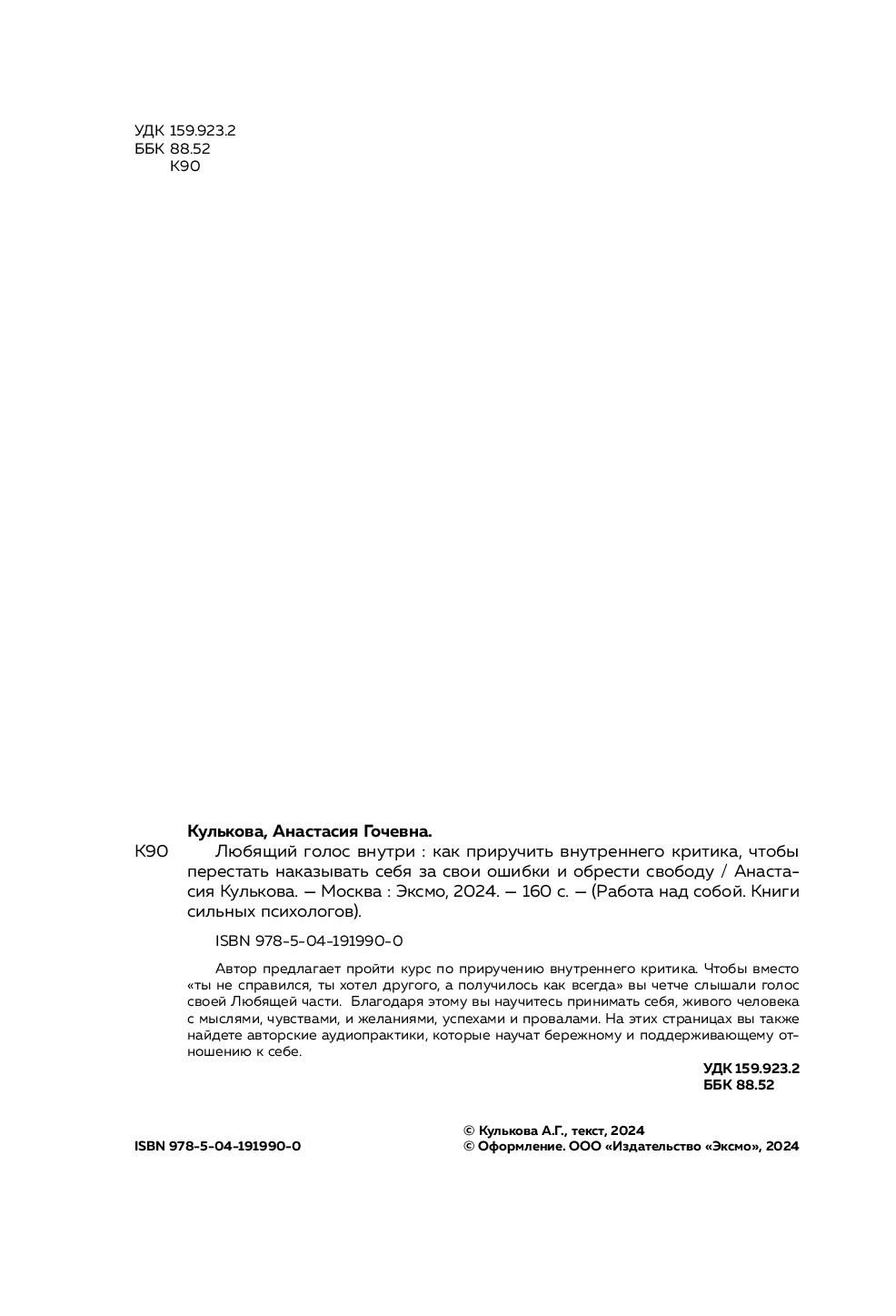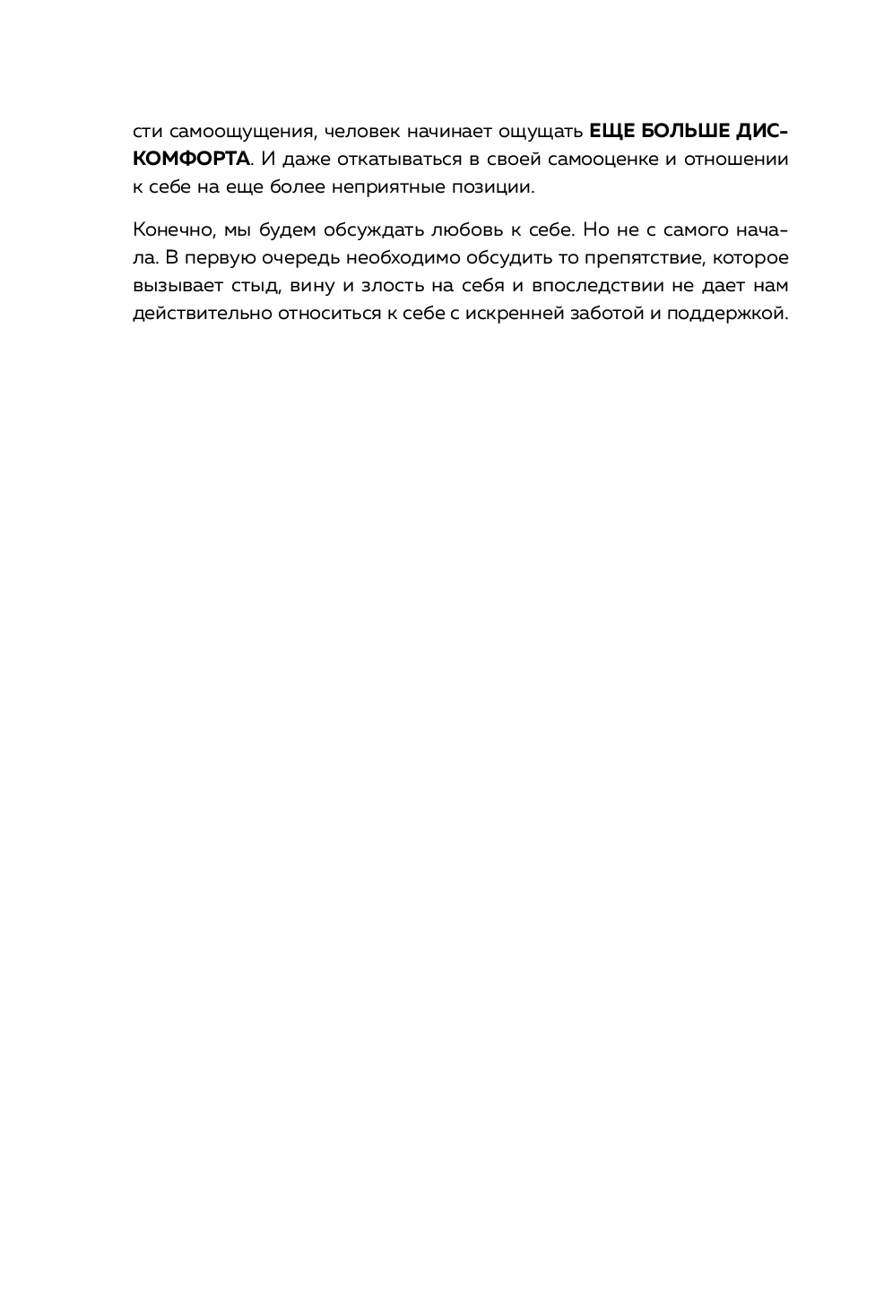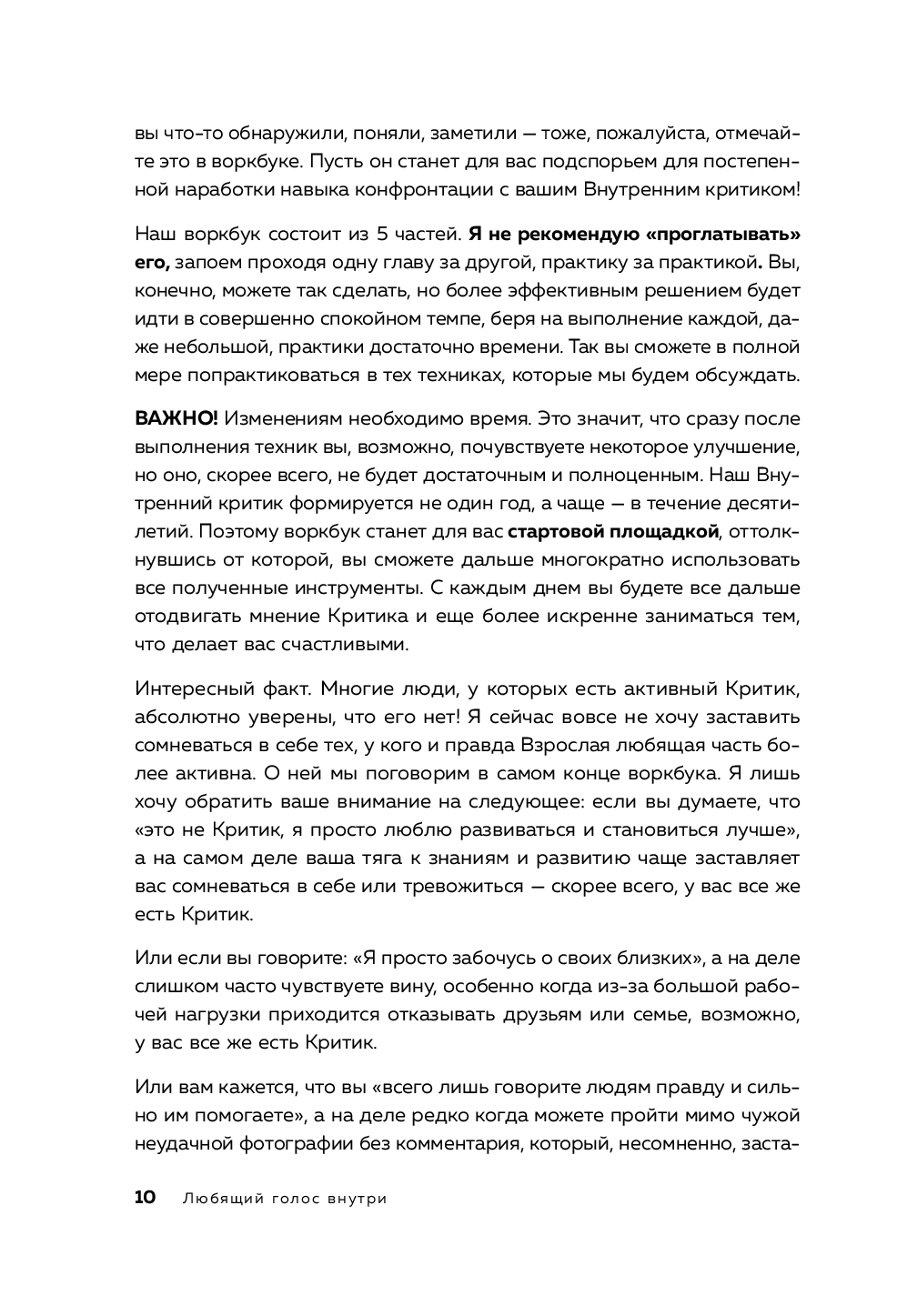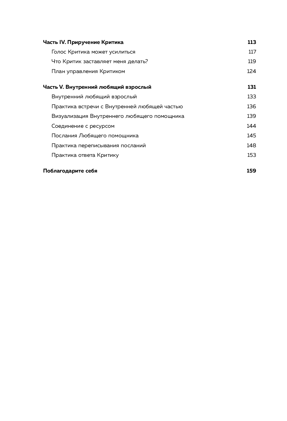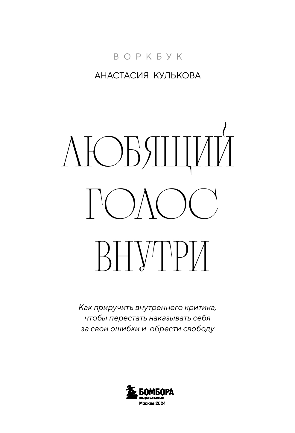 Автор предлагает пройти курс по приручению внутреннего критика. Чтобы вместо "ты не справился, ты хотел другого, а получилось как всегда", вы четче слышали голос своей Любящей части. Благодаря этому вы научитесь принимать себя, живого человека с мыслями, чувствами, и желаниями, успехами и провалами. На этих страницах вы также найдете авторские аудиопрактики, которые научат бережному и поддерживающему отношению к себе.