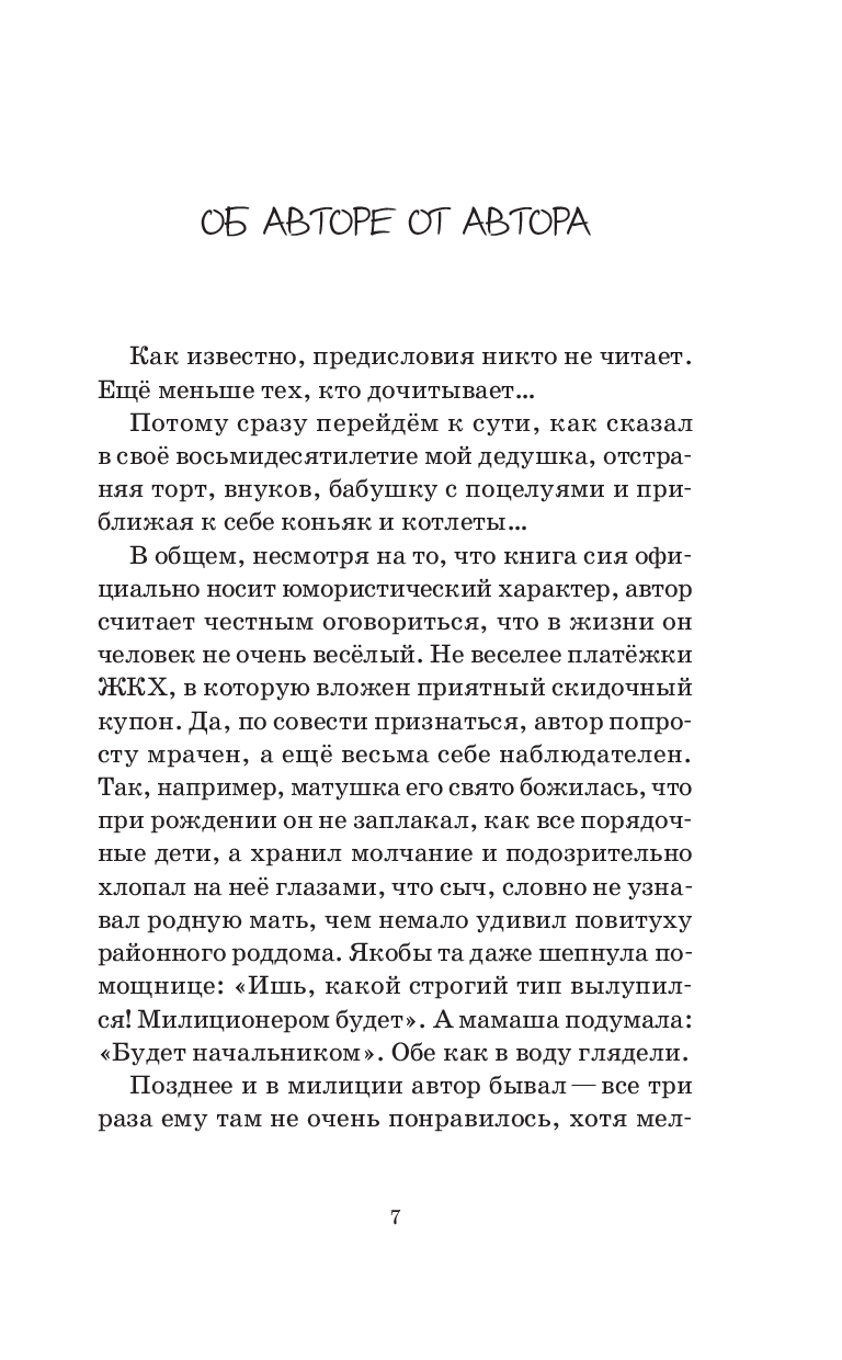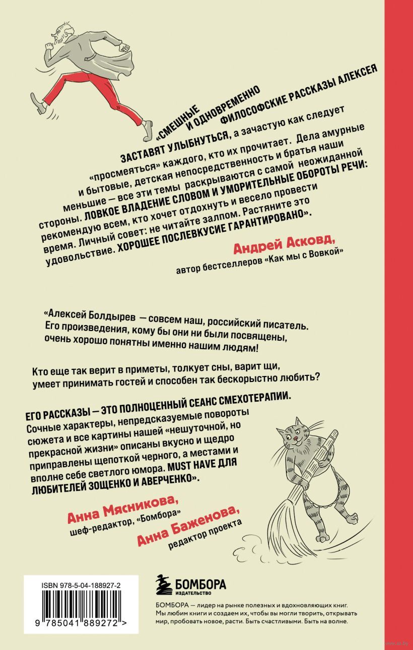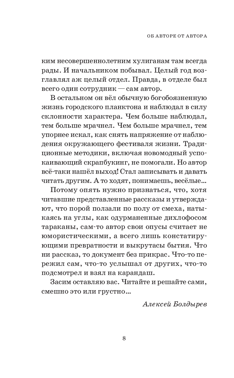 Смешные и одновременно философские рассказы Алексея Болдырева заставят улыбнуться, а зачастую как следует "просмеяться" каждого, кто их прочитает. Сочные характеры, непредсказуемые повороты сюжета и все картины нашей "не шуточной, но прекрасной жизни" описаны вкусно и щедро приправлены щепоткой черного, а местами и вполне себе светлого юмора.