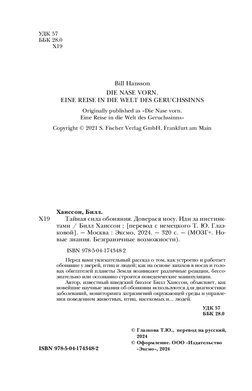 Автор, известный шведский биолог Билл Хансон, объясняет, как новейшие научные знания об обонянии используются для диагностики заболеваний, мониторинга загрязнений окружающей среды и управления поведением животных, птиц, насекомых и... людей.