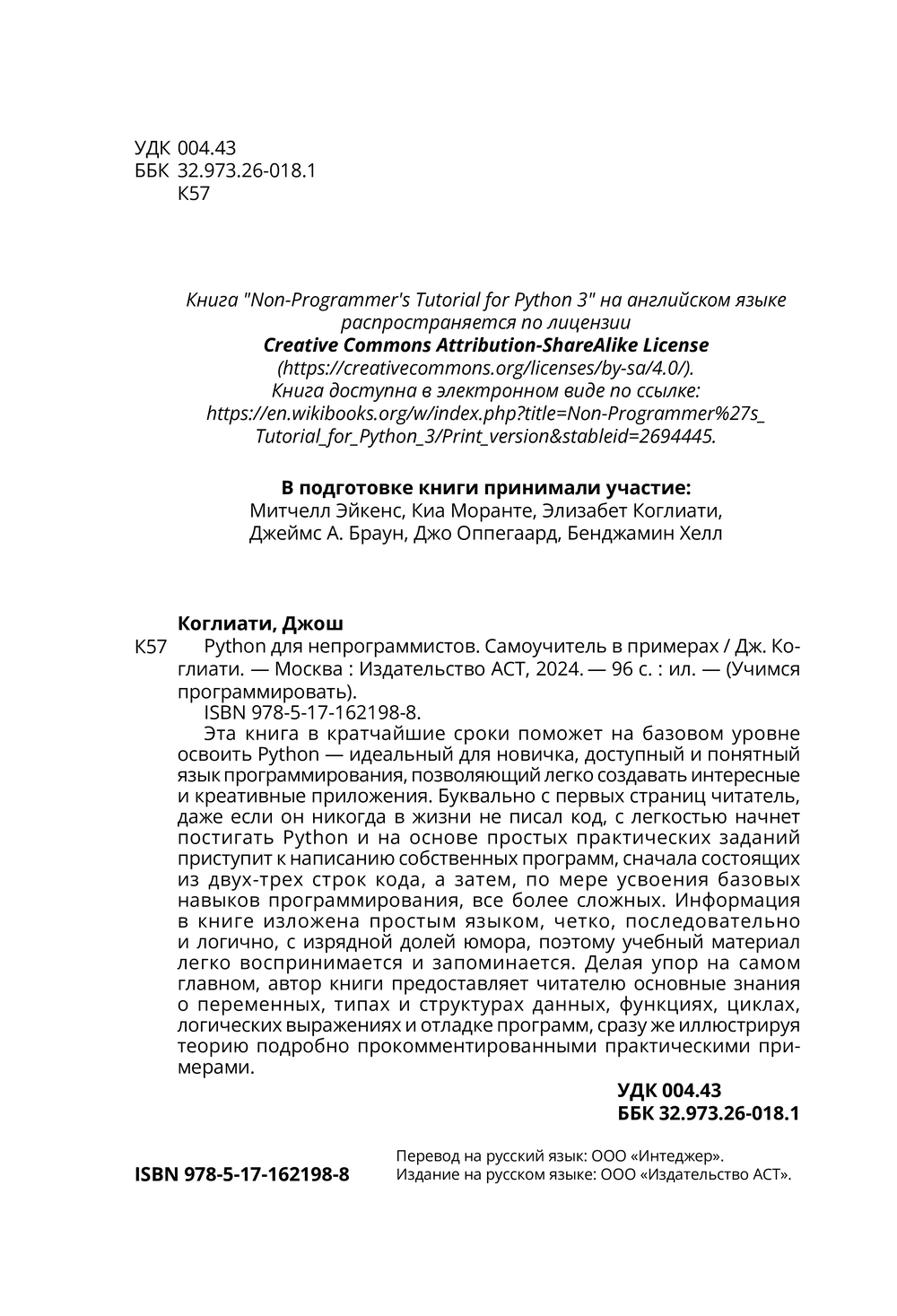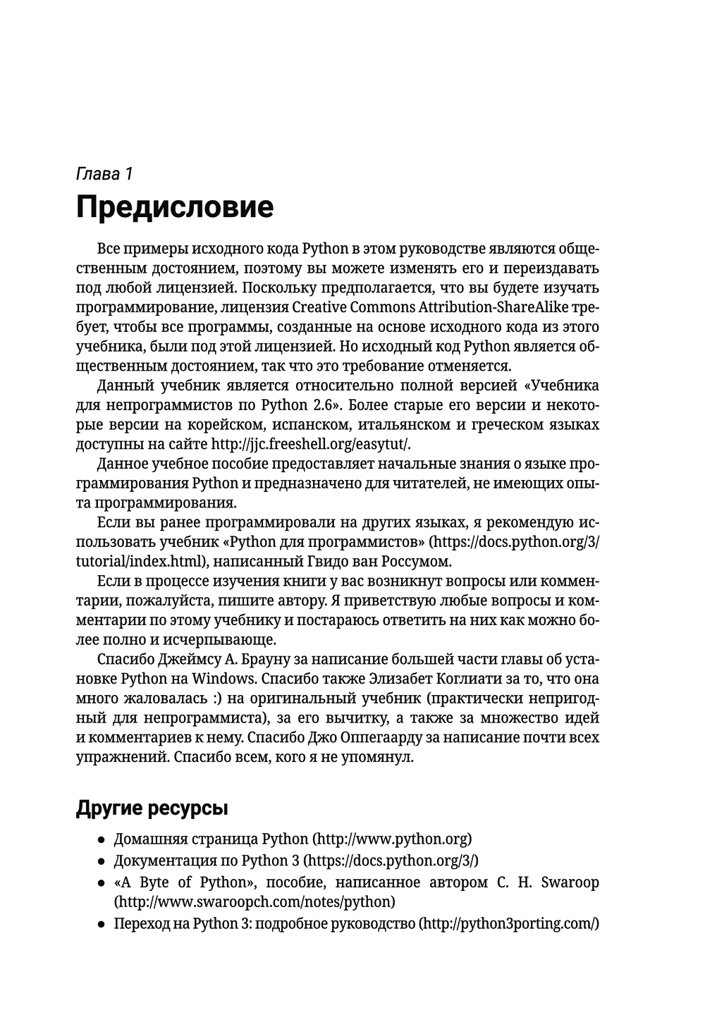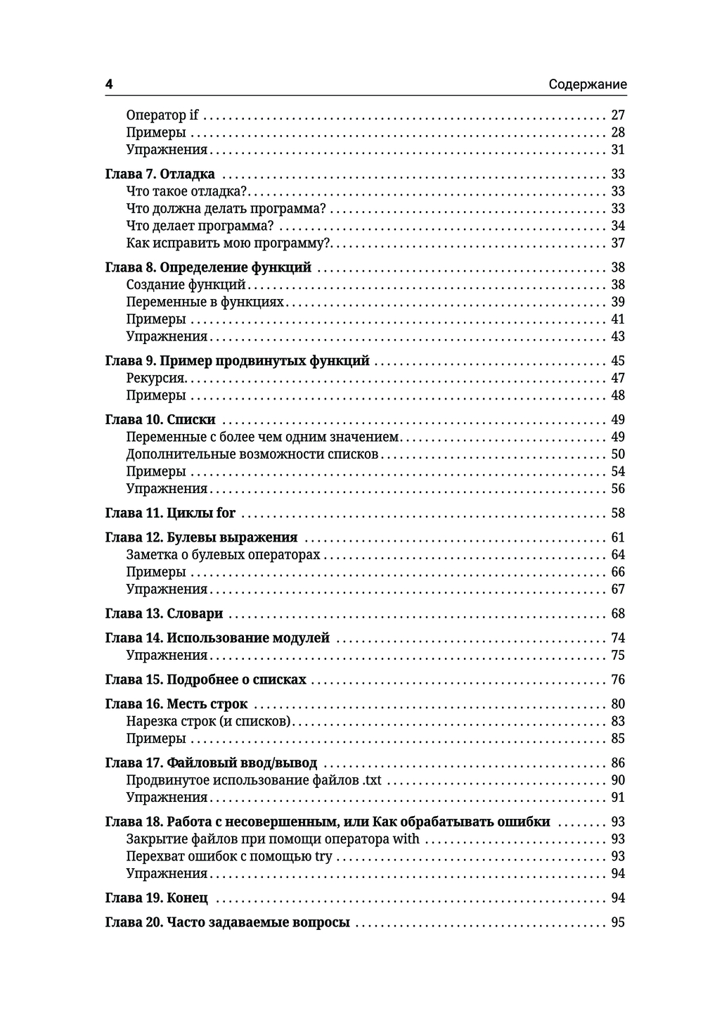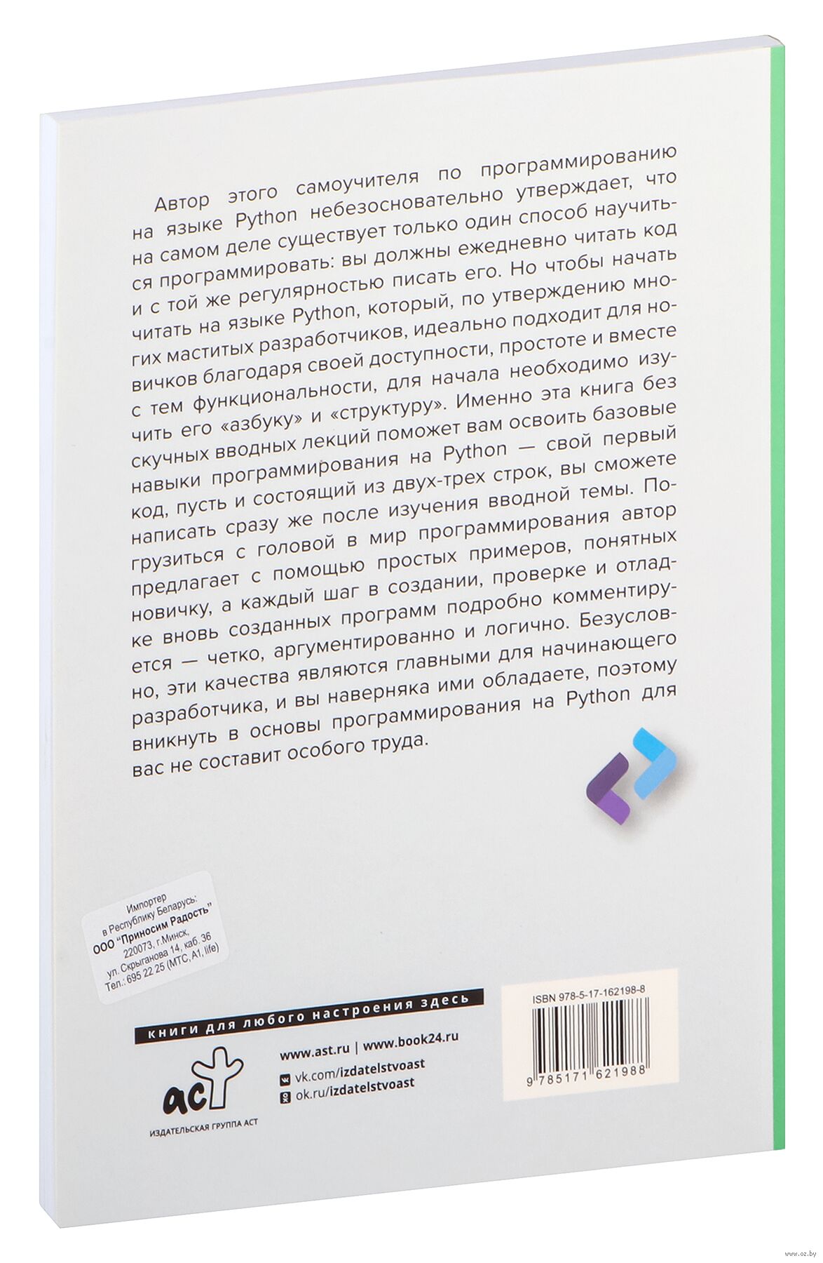 Информация в книге изложена простым языком, четко, последовательно и логично, с изрядной долей юмора, поэтому учебный материал легко воспринимается и запоминается. Делая упор на самом главном, автор книги предоставляет читателю основные знания о переменных, типах и структурах данных, функциях, циклах, логических выражениях и отладке программ, сразу же иллюстрируя теорию подробно прокомментированными практическими примерами.