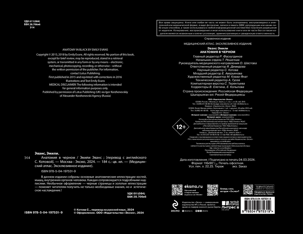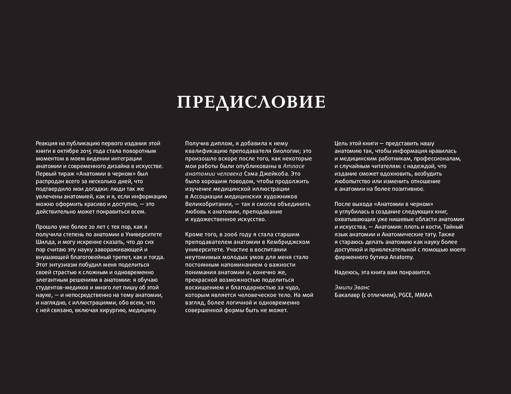 Это необычное издание "Черная анатомия" перевернет ваше мнение об атласах. Необычно оформление – золото и черный атлас – напомнят, как ценно человеческое тело. Автор книги – Эмили Эванс собрала основные анатомические рисунки костей, мускулов и внутренних органов с подробными надписями. Изучение анатомии еще никогда не было так близко к искусству.