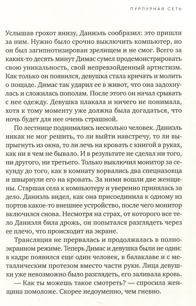 Но почему оно настолько важно для нее, не догадывается даже никто из ее коллег. Именно "Пурпурная Сеть" когда-то похитила ее сына Лукаса и, вероятно, втянула в жестокие пытки и убийства. Роман начинается с визита нескольких полицейских шестнадцатилетнего Даниэля, которые застают его за просмотром "реалити-шоу", где жестоко истязают девушку.