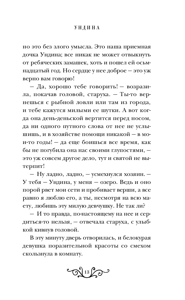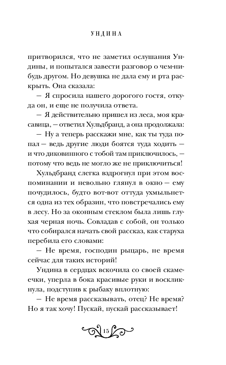 Культовая история о любви и предательстве, написанная классиком зарубежной литературы Фридрихом де ла Мотт Фуке. На основе сюжета написано более семи оперных произведений, снято более десяти художественных фильмов. "Ундина" продолжает жить в тысячах историй про русалок, морских дев и водных духов, которые по несчастливой случайности влюбляются в представителей рода человеческого.