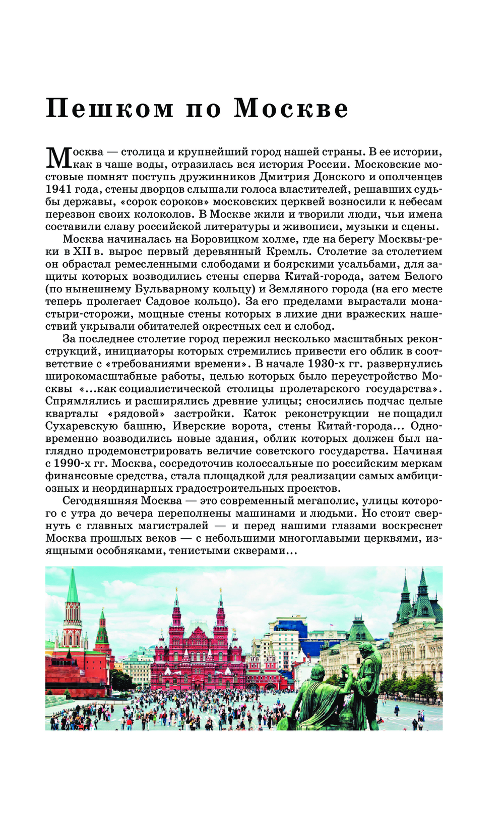 Сегодняшняя Москва – это современный мегаполис, улицы которого с утра до вечера переполнены машинами и людьми. Но стоит свернуть с главных магистралей – и перед нашими глазами воскреснет город прошлых веков – с небольшими многоглавыми церквями, изящными особняками, тенистыми скверами... Этот уникальный путеводитель для пешеходов будет незаменим для тех, кто захочет сам прогуляться по Москве. Построение маршрутов по принципу "от метро" и "до метро" позволят увидеть все самое интересное. Планы и схемы помогут легко найти дорогу, даже если вы отклонитесь от проложенного маршрута. Небольшой формат издания, плотная бумага и прошитые страницы, при этом, небольшой вес издания, что позволяет взять книгу с собой в путешествие. Читайте и гуляйте по городу с удовольствием. Путешествовать по России интересно, познавательно и увлекательно.