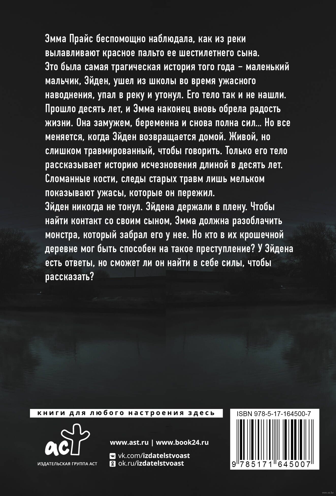 Прошло десять лет, и Эмма наконец вновь обрела радость жизни. Она замужем, беременна и снова полна сил... Но все меняется, когда Эйден возвращается домой. Живой, но слишком травмированный, чтобы говорить. Только его тело рассказывает историю исчезновения длиной в десять лет. Сломанные кости, следы старых травм лишь мельком показывают ужасы, которые он пережил.