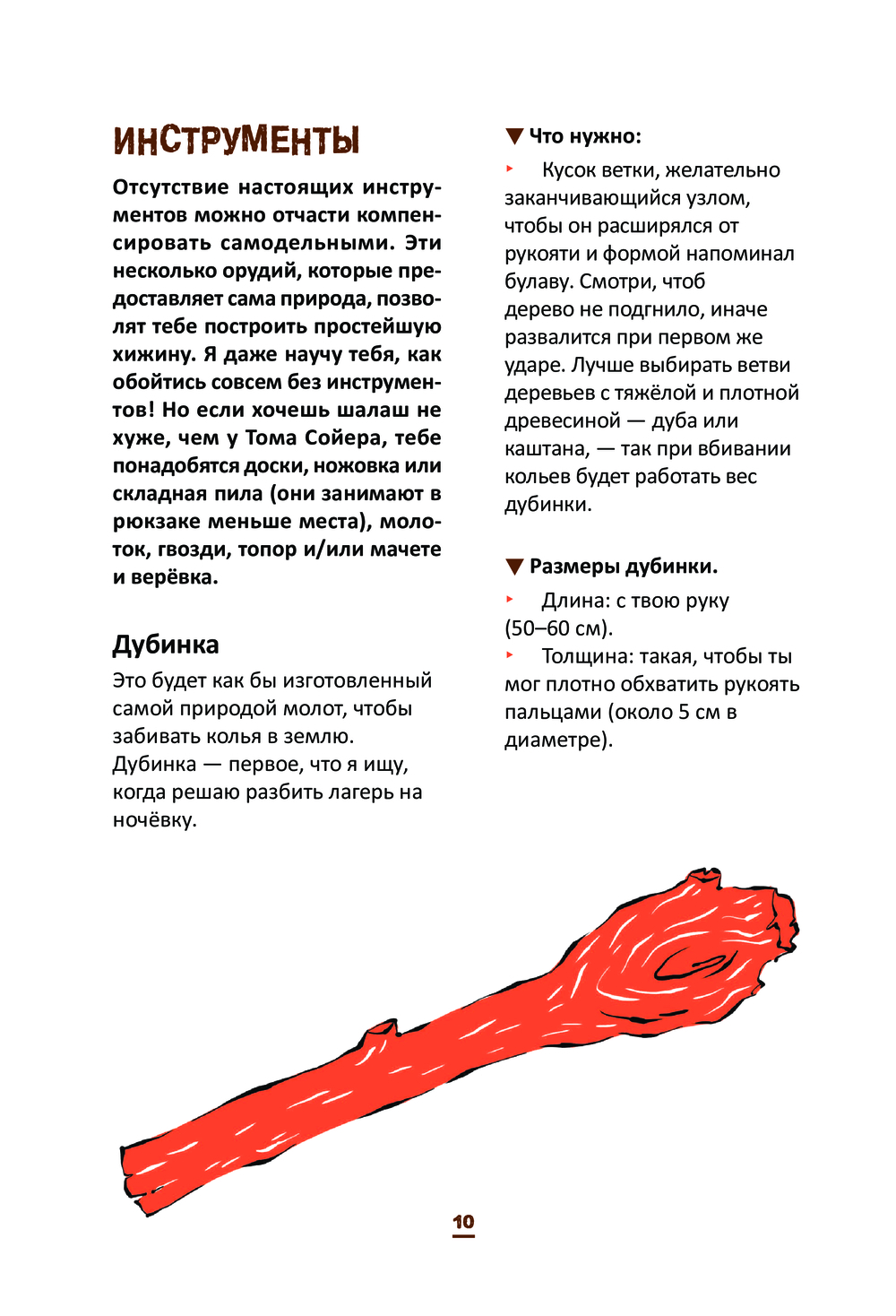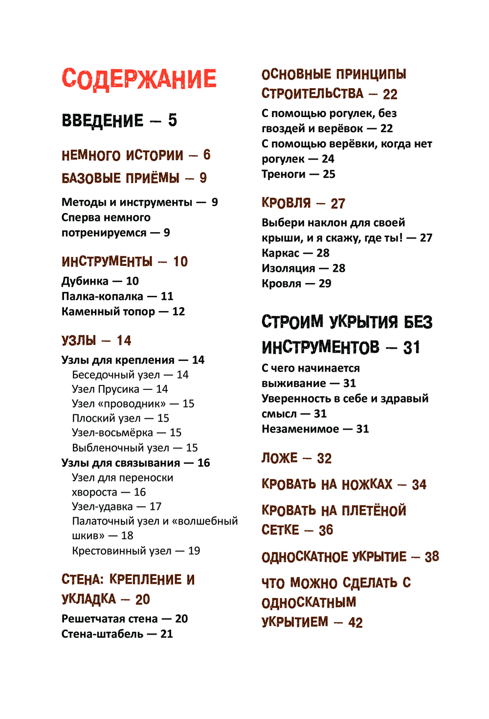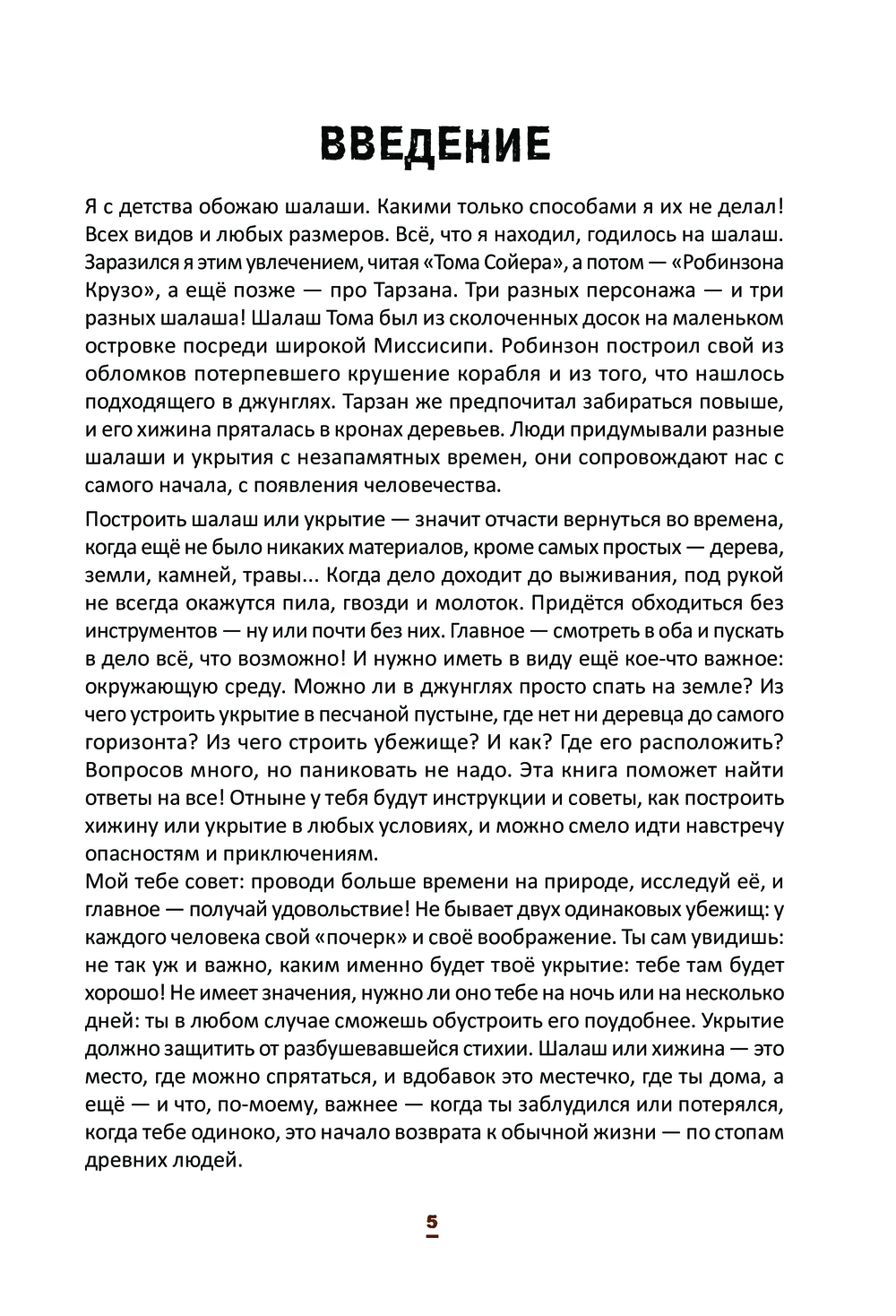 Автор книги – Максим Бертон, опытный искатель приключений и профессионал в области выживания. Он подготовил для вас 22 инструкции, которые помогут построить самые разные укрытия: от квинжи (чтобы спрятаться от снегопада) и хижины Робинзона (защитит от палящего солнца) до настоящего домика на дереве. В книге вы найдёте основные техники строительства и узнаете, какие материалы и инструменты вам понадобятся для вашего убежища.