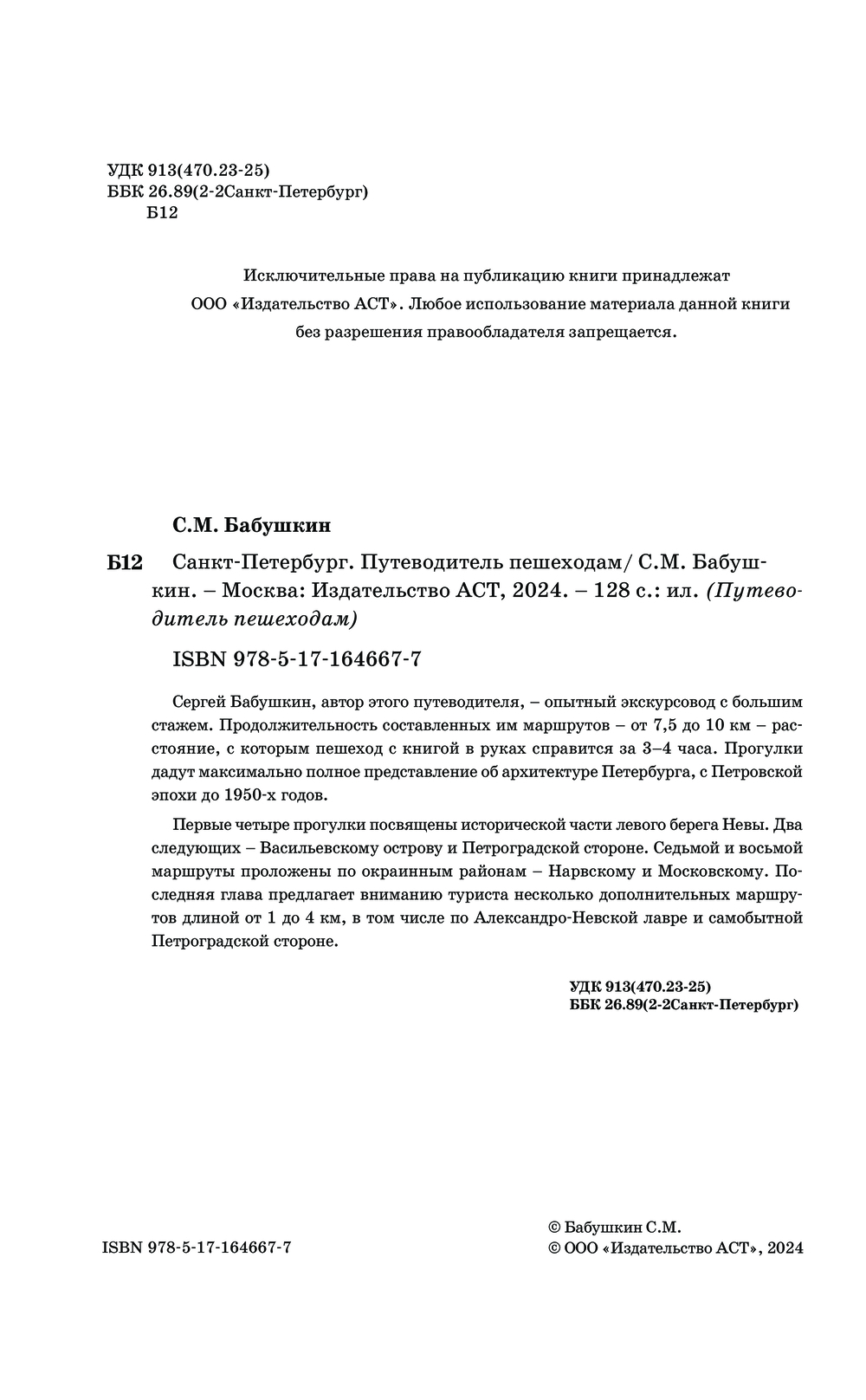 Сергей Бабушкин, автор этого путеводителя – опытный экскурсовод с семилетним стажем. Продолжительность сосотавленных им маршрутов – от 7,5 до 10 км – расстояние, с которым пешеход с книгой в руках справится за 3-4 часа. Прогулки дадут максимально полное представление об архитектуре Петербурга, с Петровской эпохи до 1950-х годов.
