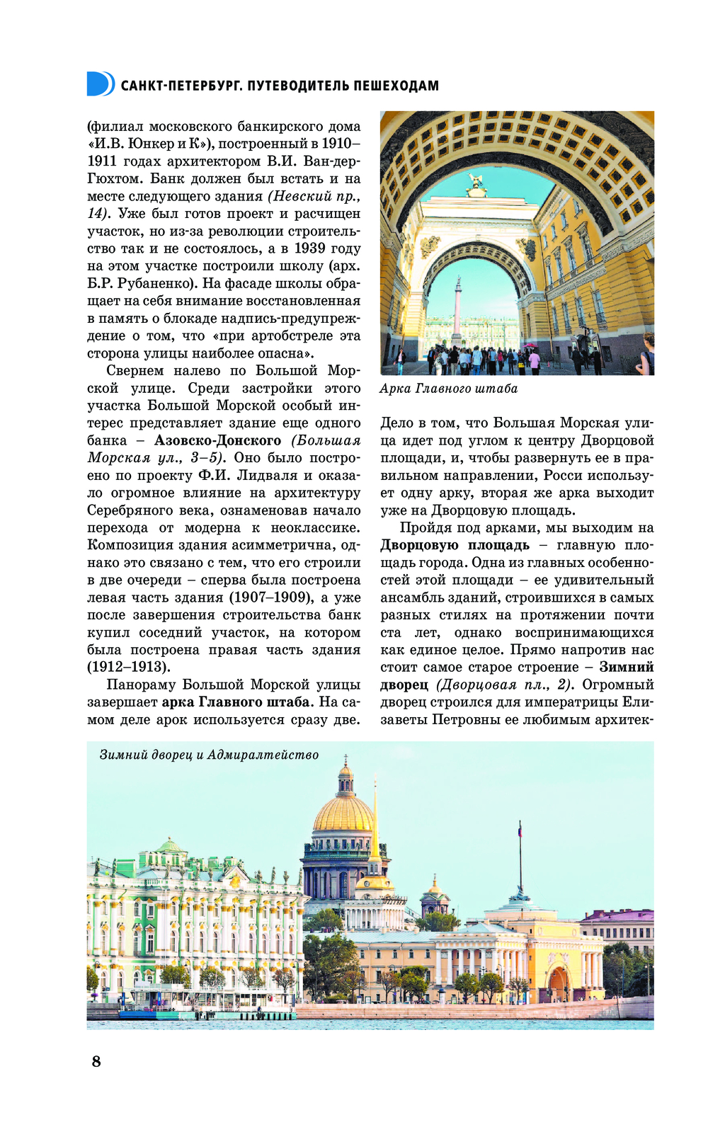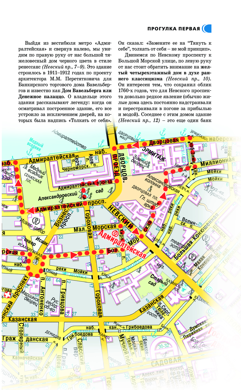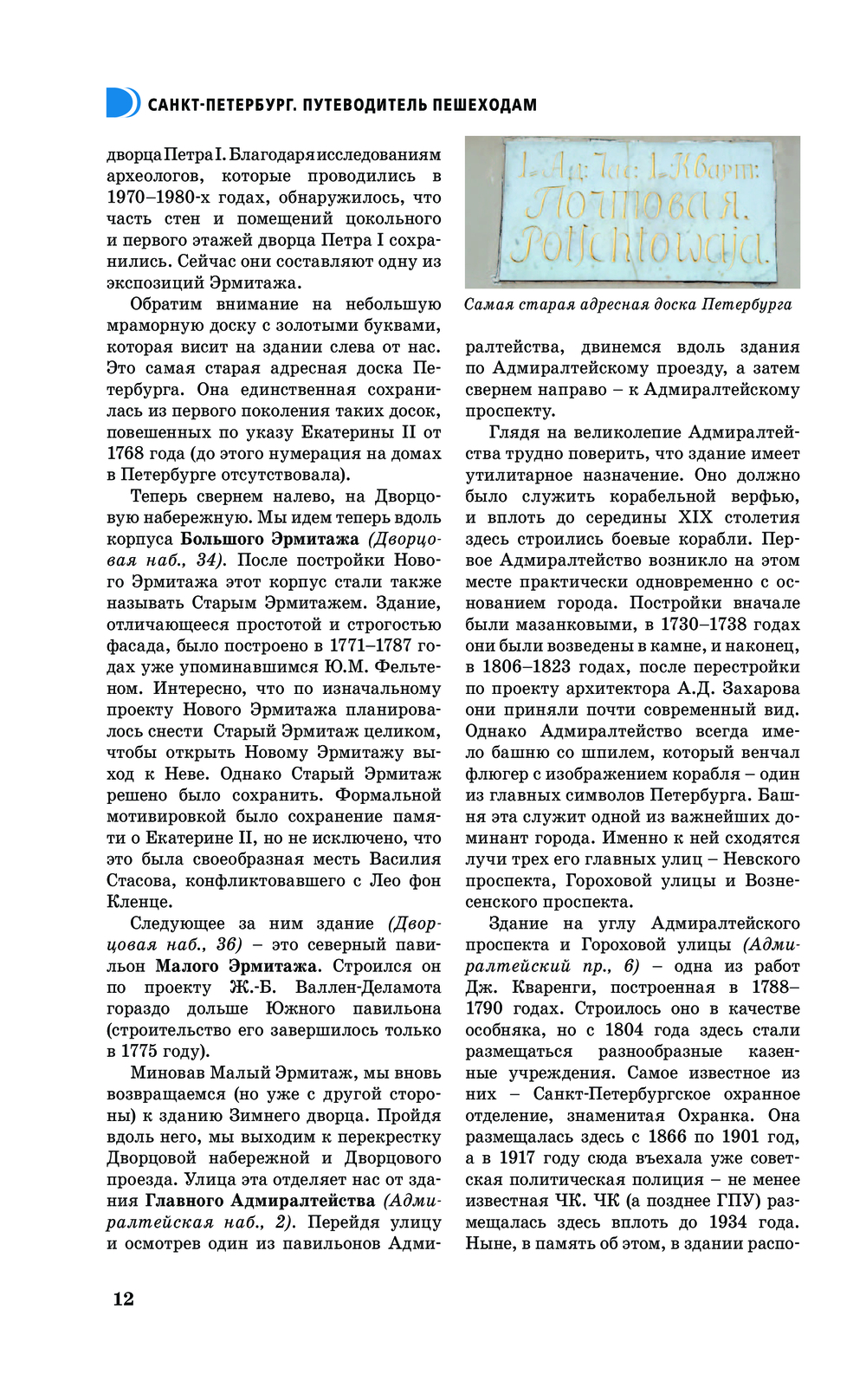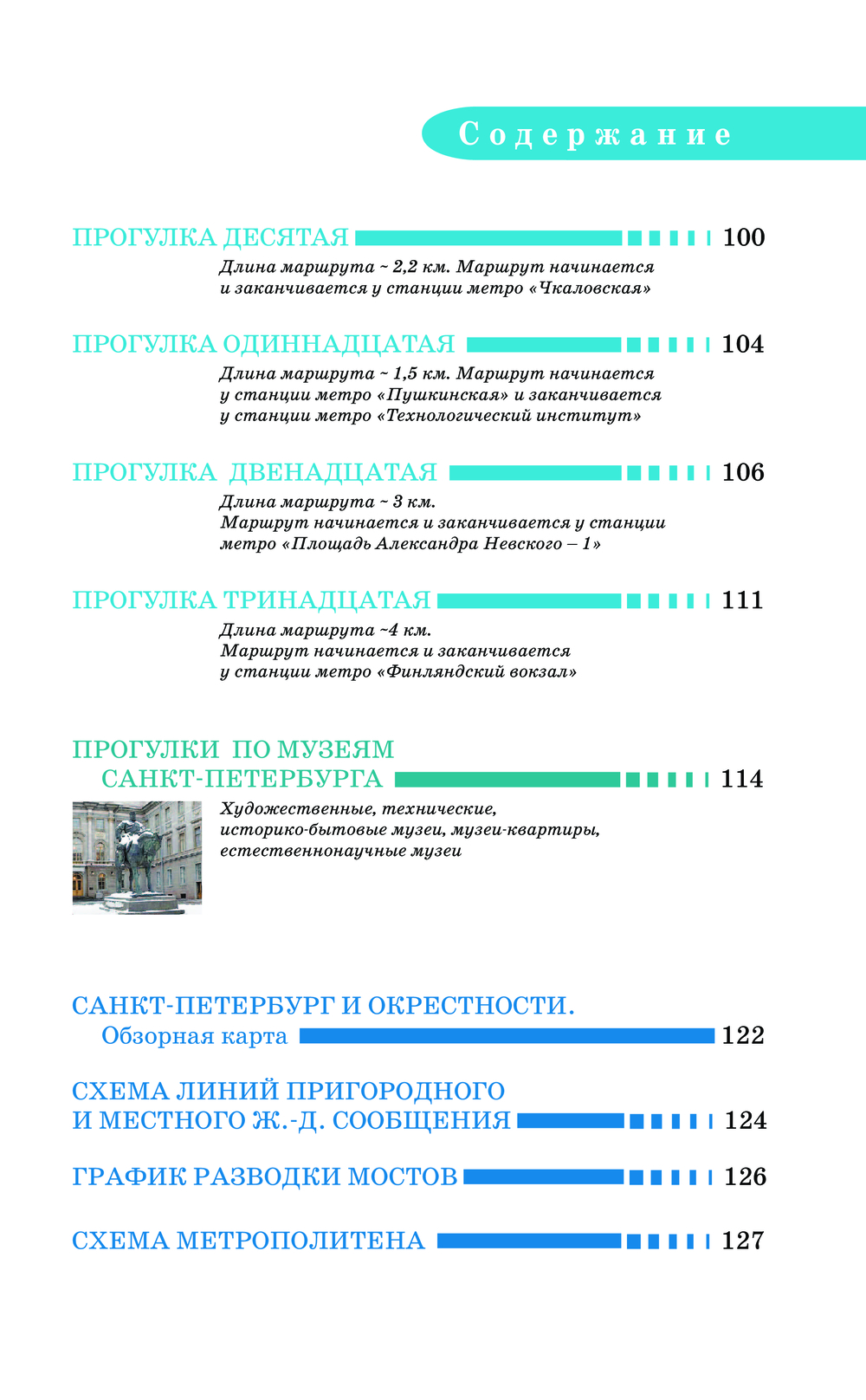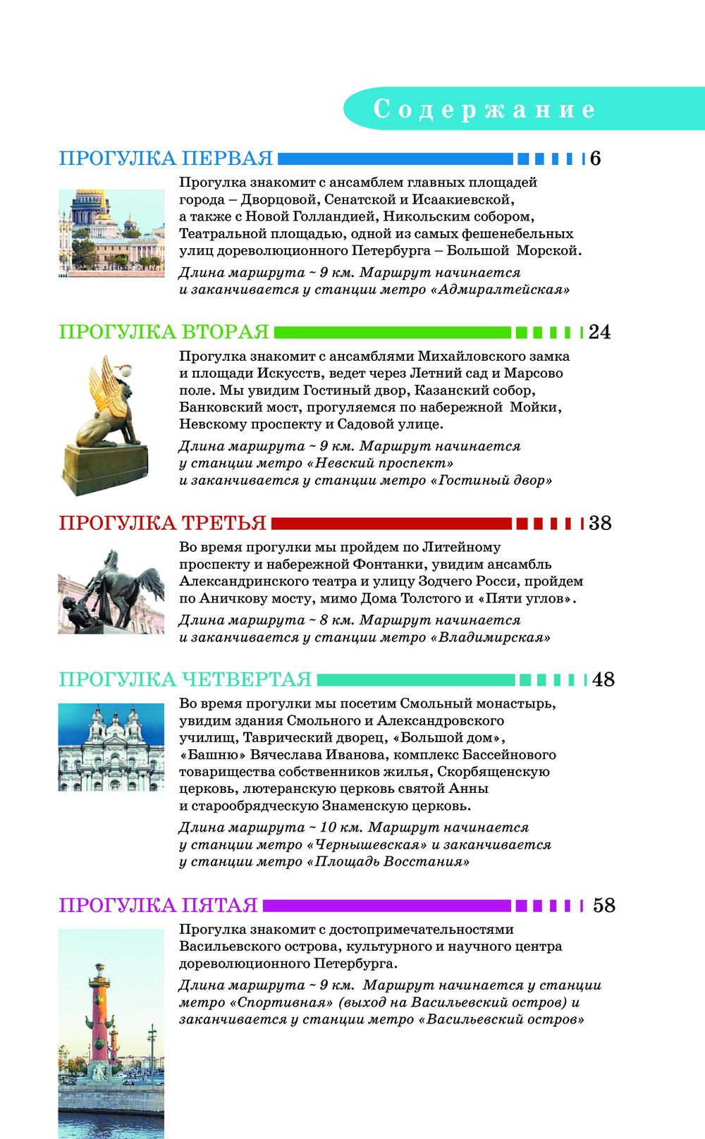 Первые четыре прогулки посвящены исторической части левого берега Невы. Два следующих – Васильевскому острову и Петроградской стороне. Седьмой и восьмой маршруты проложены по окраинным районам – Нарвскому и Московскому. Последняя глава предлагает вниманию туриста несколько дополнительных маршрутов длиной от 1 до 4 км, в том числе по Александро-Невской лавре и самобытному Петроградскому району.
