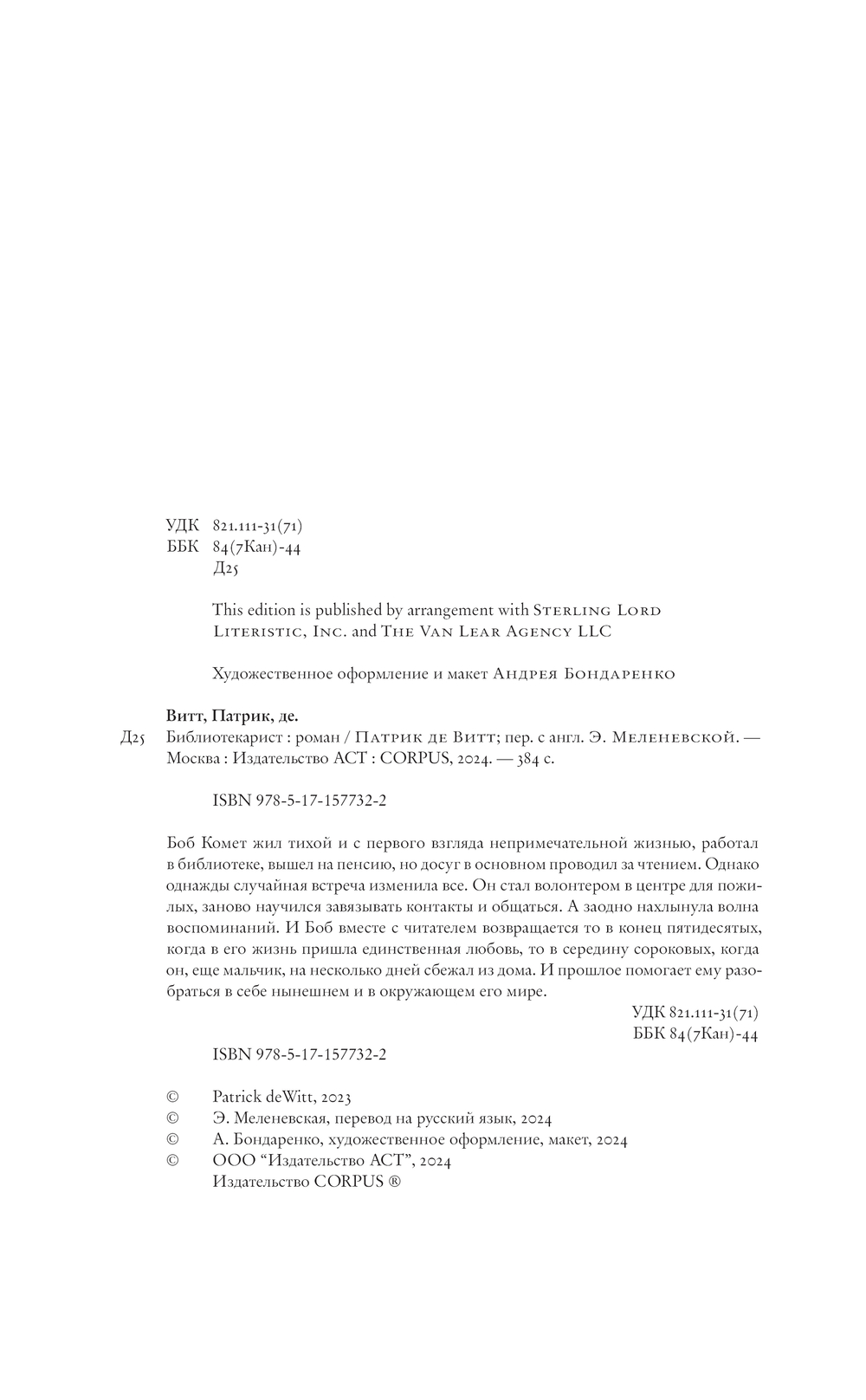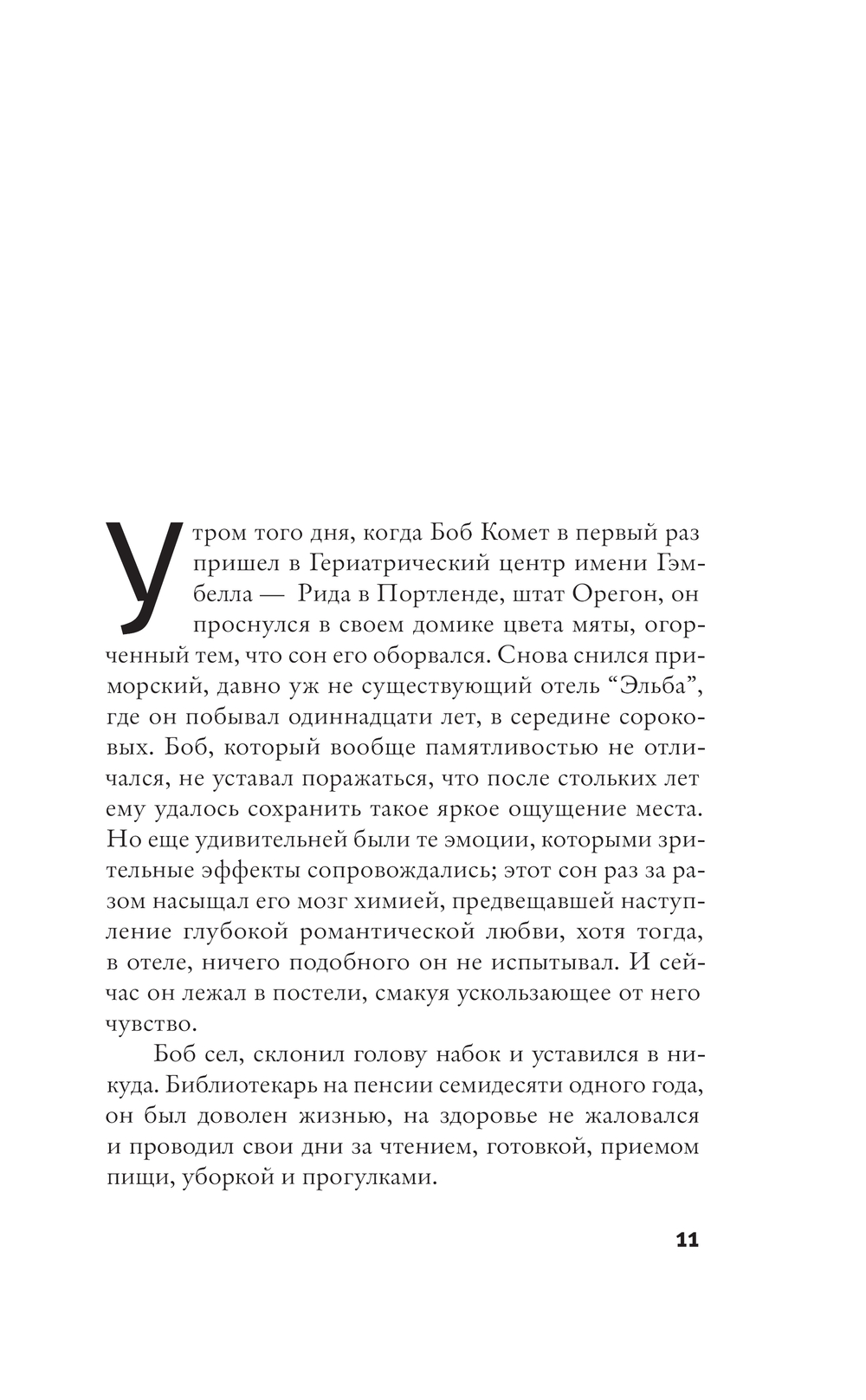 Боб Комет жил тихой и с первого взгляда непримечательной жизнью, работал в библиотеке, вышел на пенсию, но досуг в основном проводил за чтением. Однако однажды случайная встреча изменила все. Он стал волонтером в центре для пожилых, заново научился завязывать контакты и общаться. А заодно нахлынула волна воспоминаний. И Боб вместе с читателем возвращается то в конец пятидесятых, когда в его жизнь пришла единственная любовь, то в середину сороковых, когда он, еще мальчик, на несколько дней сбежал из дома. И прошлое помогает ему разобраться в себе нынешнем и в окружающем его мире.
