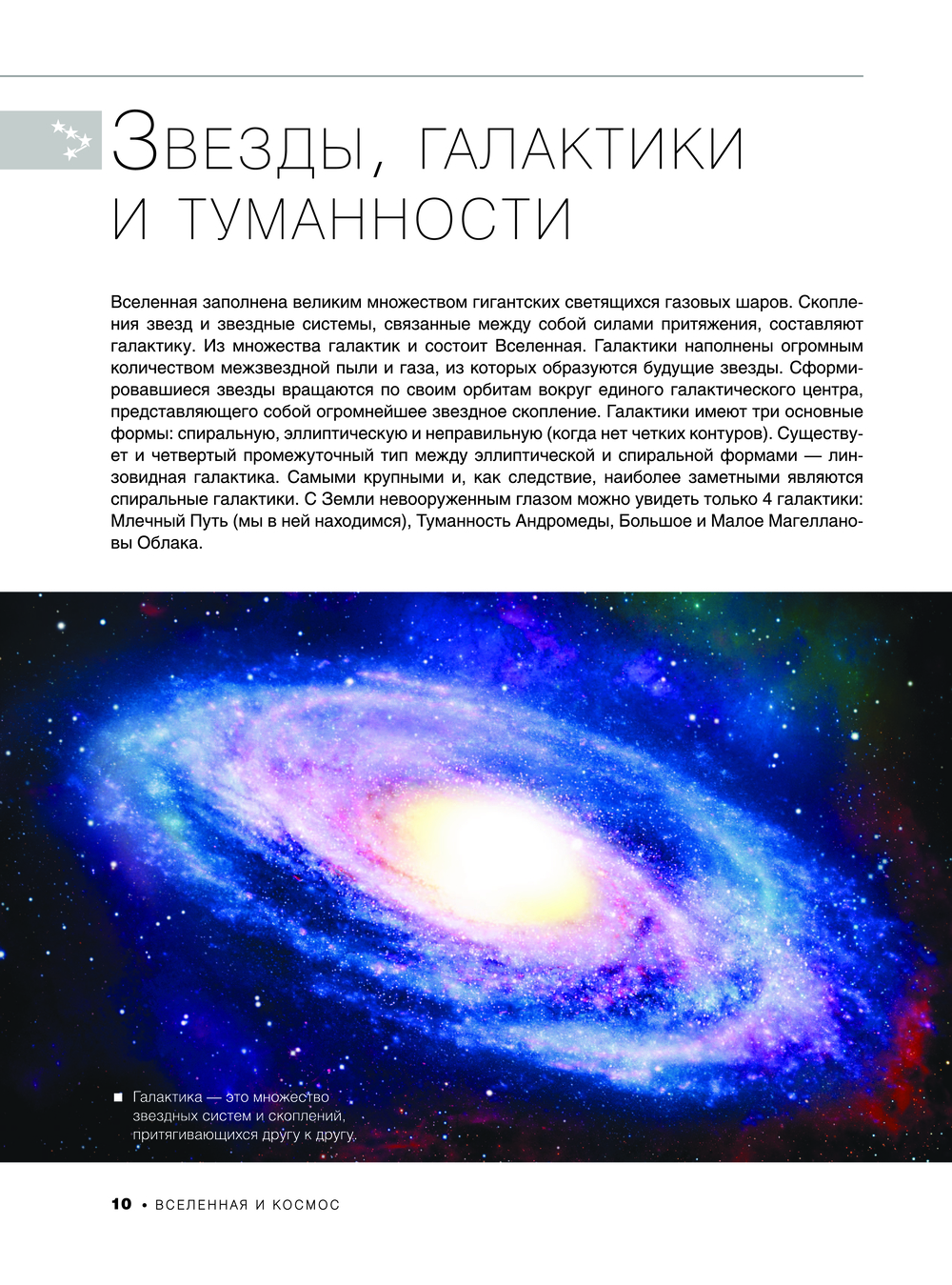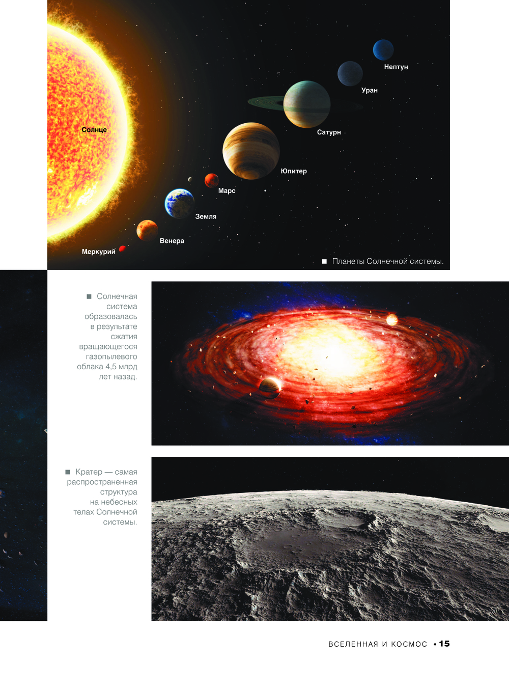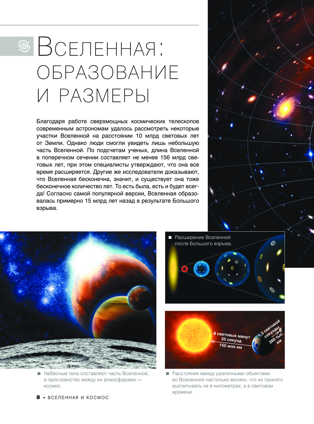 Звезды и галактики, планеты Солнечной системы, астероиды, метеороиды и кометы, космические корабли и орбитальные станции, океаны и моря, горы, пещеры и вулканы, природные зоны и явления, вулканы и гейзеры, страны, города и население, животный мир всех континентов, чудеса света древние и современные – все это и многое другое представлено в этом издании. Все темы раскрываются на основе интересных фактов и множества уникальных фотографий, а их здесь более 1000! И главное – многие страницы вы можете "оживить", ведь эта книга с дополненной реальностью. А это значит, что у вас есть возможность, например, заглянуть внутрь всех планет, увидеть, как они устроены, побывать на станции "Мир" и МКС, исследовать моря, горы и пустыни нашей планеты, со всех сторон рассмотреть фигурки загадочных моаи и дольмены таинственного Стоунхенджа, понаблюдать за удивительными животными, обитающими во всех уголках земли, изучить Колизей и Собор Василия Блаженного, полюбоваться величественным Эльбрусом и Фудзиямой.
