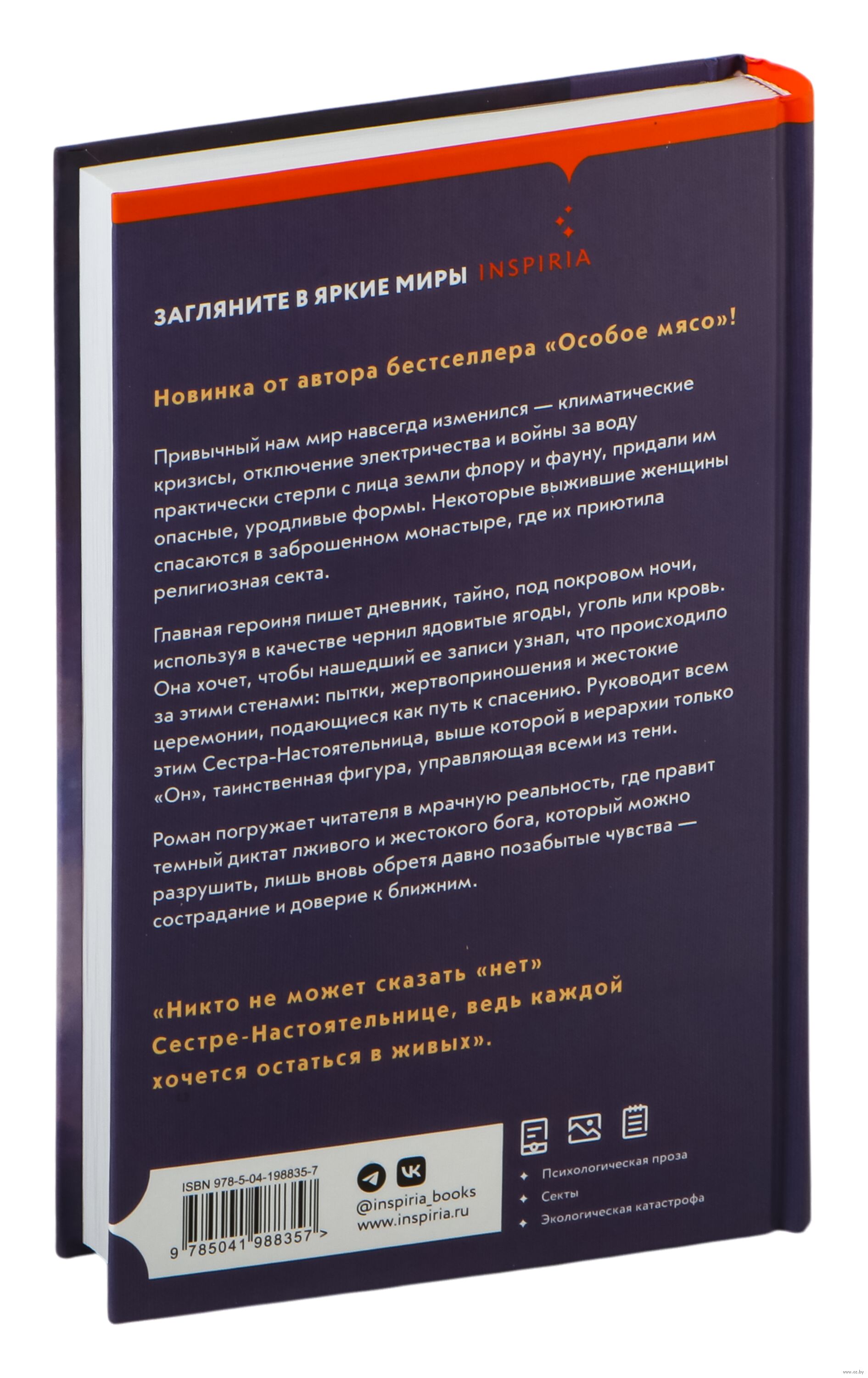 Привычный нам мир навсегда изменился – климатические кризисы, отключение электричества и войны за воду практически стерли с лица земли флору и фауну, которая теперь выродилась в опасные, уродливые формы. Некоторые выжившие женщины спасаются в заброшенном монастыре, где их приютила религиозная секта. Главная героиня пишет дневник, тайно, под покровом ночи, используя в качестве чернил ядовитые ягоды, уголь или кровь. Она хочет, чтобы нашедший ее записи узнал, что происходило за этими стенами: пытки, жертвоприношения и жестокие церемонии, подающиеся как путь к спасению. Руководит всем этим сестра-настоятельница, выше которой в иерархии только "Он", таинственная фигура, управляющая всеми из тени. Роман погружает читателя в мрачную реальность, где правит темный диктат лживого и жестокого бога, который можно разрушить лишь вновь обретя давно позабытые чувства – сострадание и доверие к ближним.