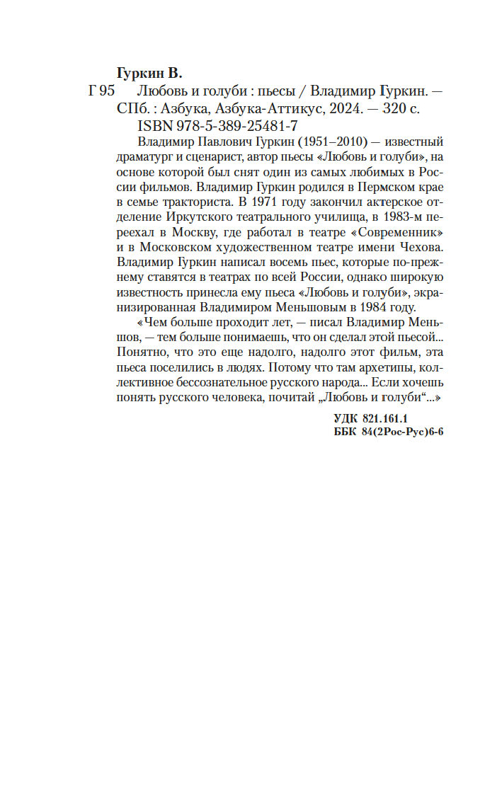Владимир Павлович Гуркин (1951-2010) – известный драматург и сценарист, автор пьесы "Любовь и голуби", на основе которой был снят один из самых любимых в России фильмов. Владимир Гуркин родился в Пермском крае в семье тракториста. В 1971 году закончил актерское отделение Иркутского театрального училища, в 1983-м переехал в Москву, где работал в театре "Современник" и в Московском художественном театре имени Чехова. Владимир Гуркин написал восемь пьес, которые по-прежнему ставятся в театрах по всей России, однако широкую известность принесла ему пьеса "Любовь и голуби", экранизированная Владимиром Меньшовым в 1984 году.
