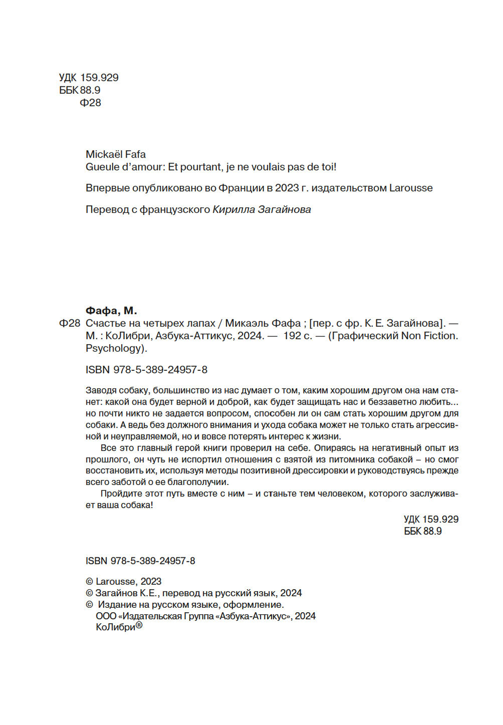 Все это главный герой книги проверил на себе. Опираясь на негативный опыт из прошлого, он чуть не испортил отношения с взятой из питомника собакой – но смог восстановить их, используя методы позитивной дрессировки и руководствуясь, прежде всего, заботой о ее благополучии.