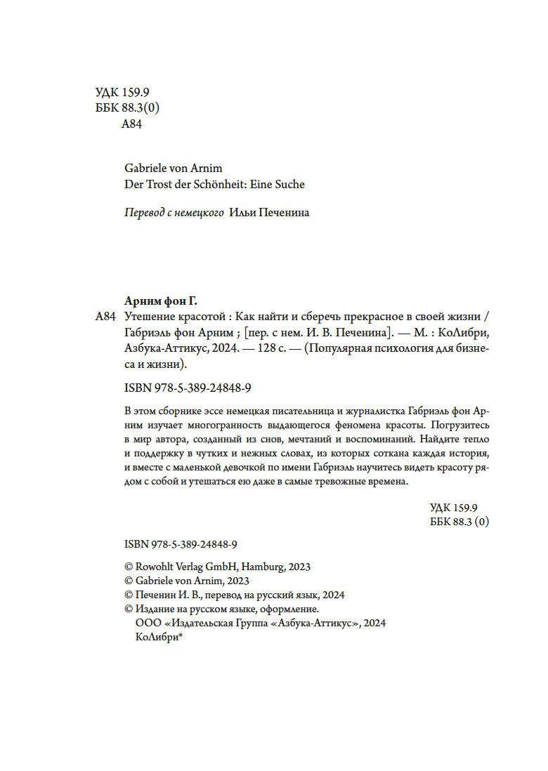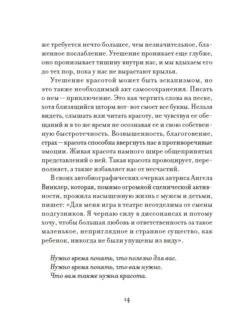 В этом сборнике эссе немецкая писательница и журналистка Габриэль фон Арним изучает многогранность выдающегося феномена красоты. Погрузитесь в мир автора, созданный из снов, мечтаний и воспоминаний. Найдите тепло и поддержку в чутких и нежных словах, из которых соткана каждая история, и вместе с маленькой девочкой по имени Габриэль научитесь видеть красоту рядом с собой и утешаться ею даже в самые тревожные времена.