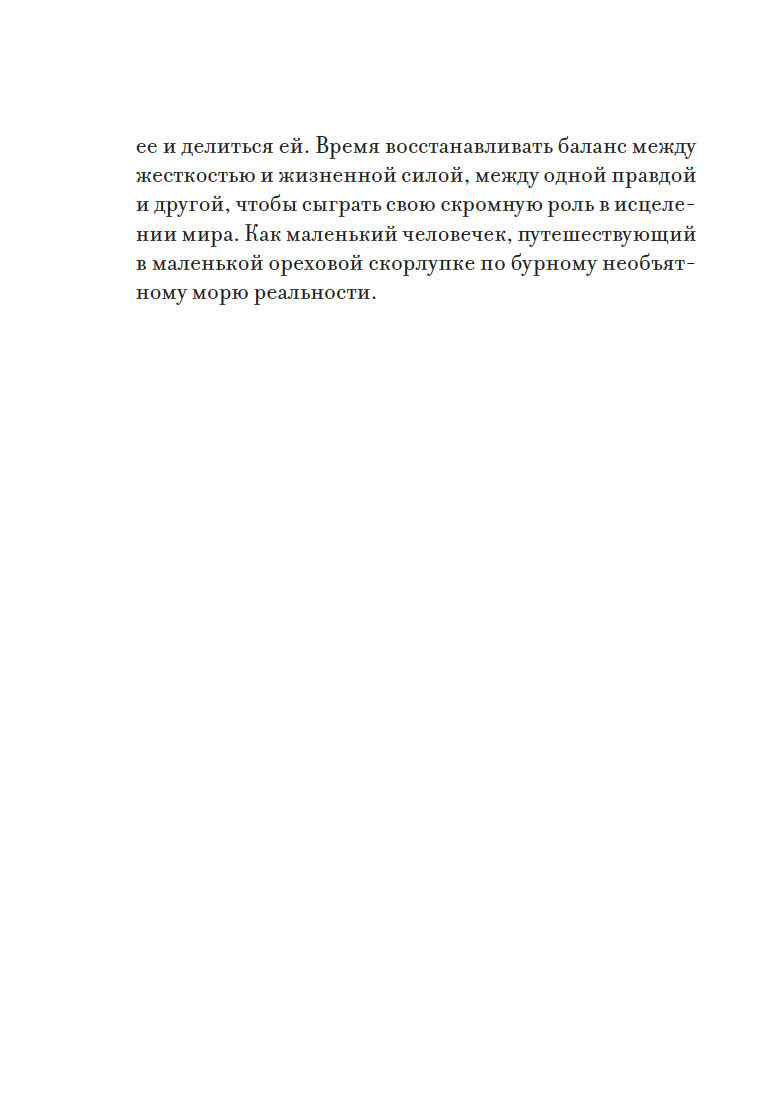 Сразу будьте готовы: 1) Есть типография изъяны на обложке - тиснение не совпадает с рисунком; 2) Книга полностью черно-белая, сплошной текст, без иллюстраций; 3) Она очень тонкая (на 126 страниц) 4) Отсутствует ляссе (которое обычно было в книгах КоЛибри этого жанра и формата). Теперь о приятном) Начала читать книгу и сразу прониклась уважением к автору! За последние пару лет наш мир очень сильно изменился и автор смело об этом пишет! Актуально - о важном, о тревожном! И предлагает свою философию, как выстоять и не потеряться! Очень рада, что эта книга нашла меня)