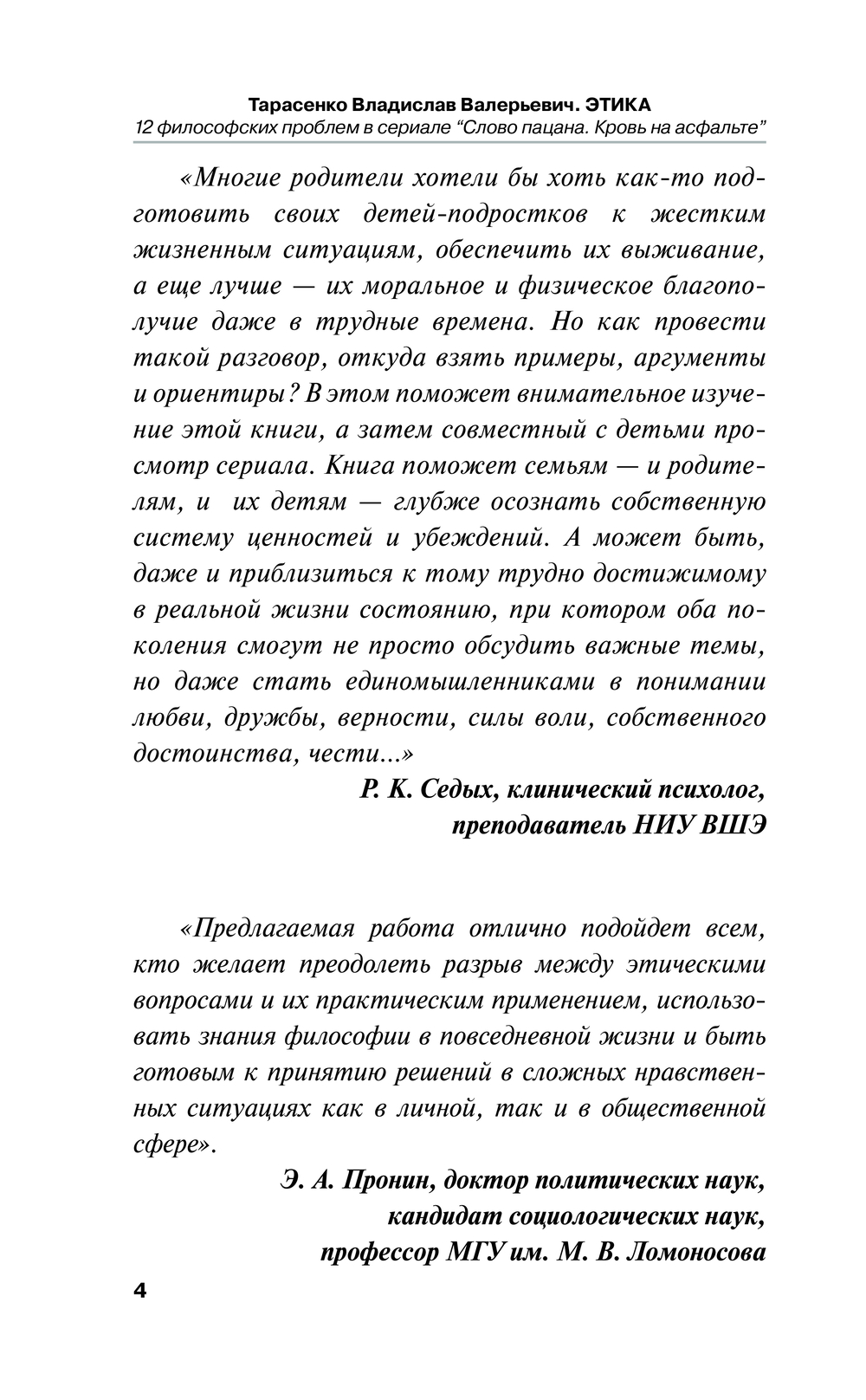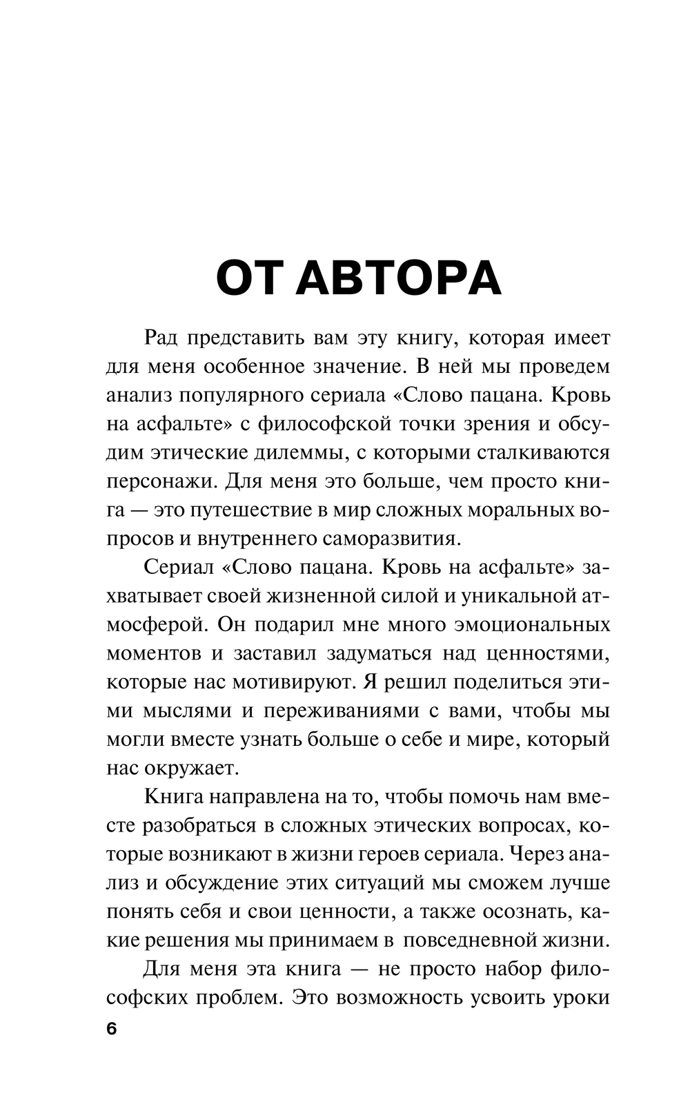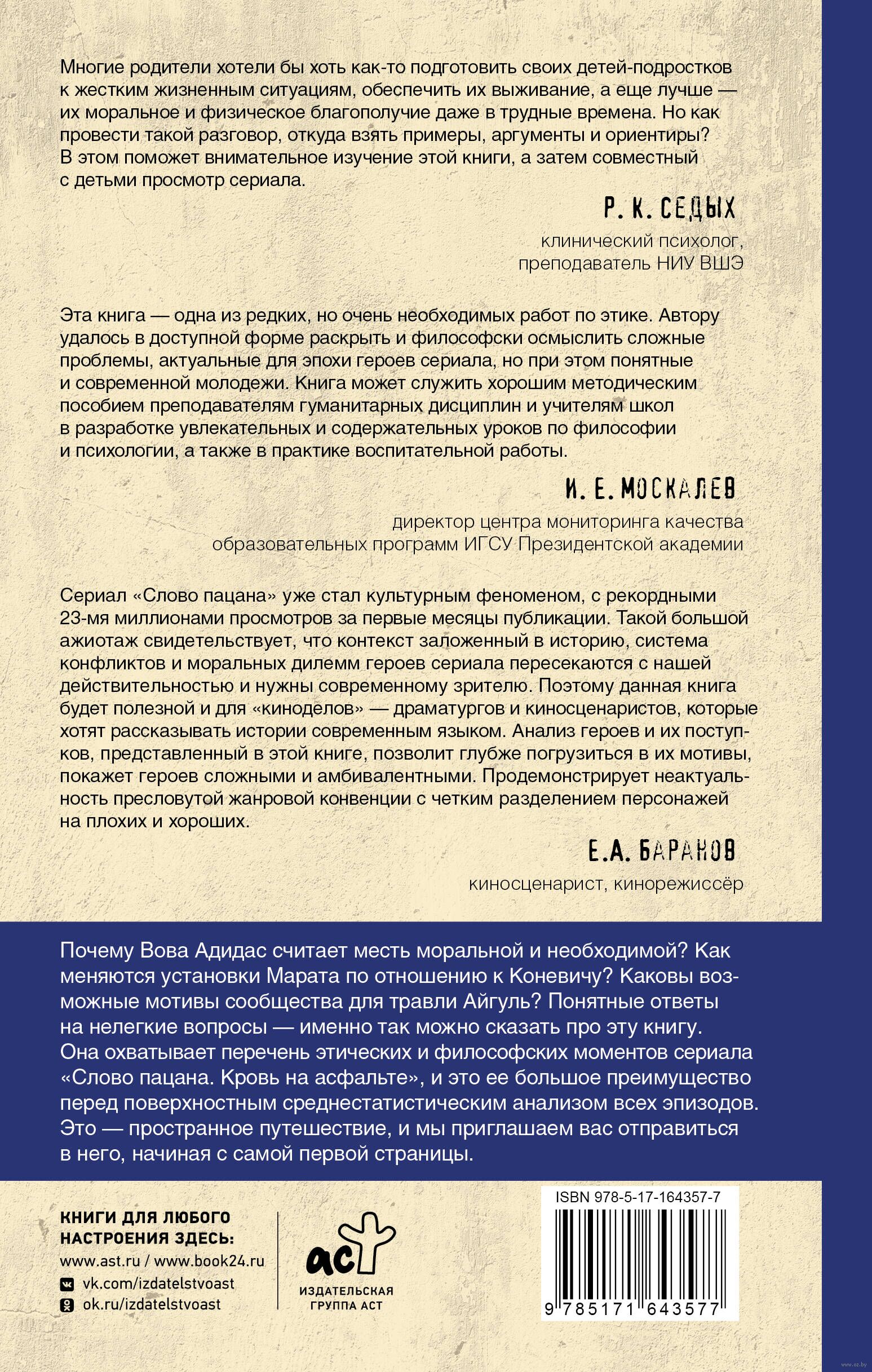 Понятные ответы на нелегкие вопросы – именно так можно сказать про эту книгу. Она охватывает перечень этических и философских моментов сериала "Слово пацана. Кровь на асфальте", и это ее большое преимущество перед поверхностным среднестатистическим анализом всех эпизодов. Это – пространное путешествие, и мы приглашаем вас отправиться в него, начиная с самой первой страницы.