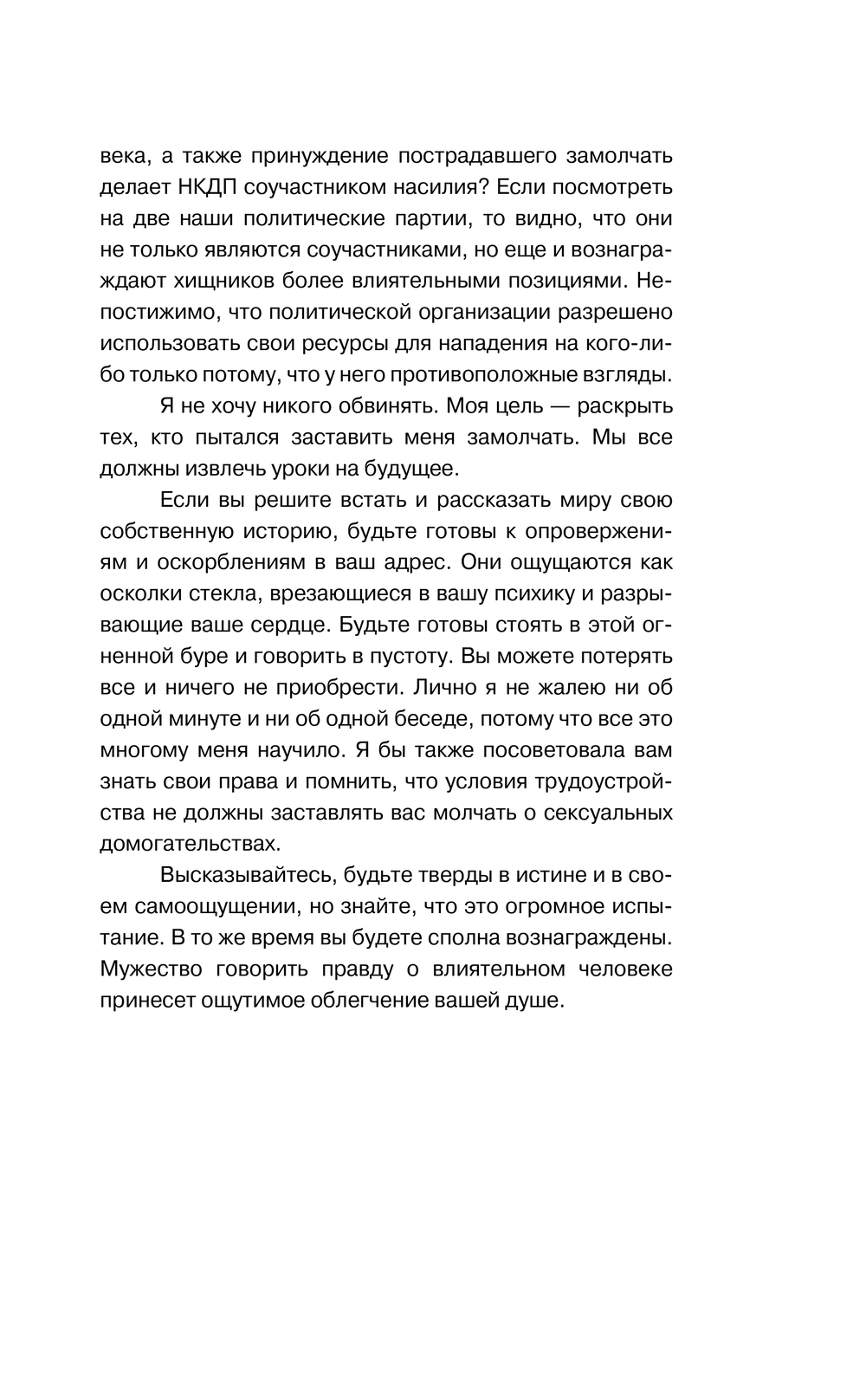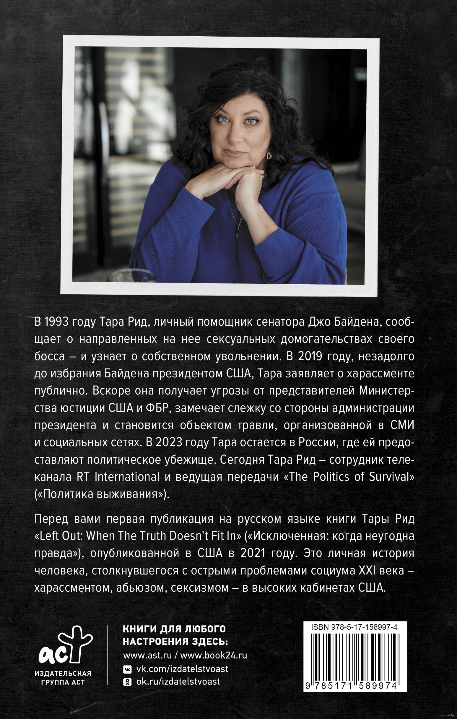 Издание представляет перевод книги Тары Рид "Left Out: When The Truth Doesn't Fit In" ("Исключенная: когда неугодна правда"), опубликованной в США в 2021 году. Автор рассказывает о том, как столкнулась с харассментом, работая личным помощником сенатора Джо Байдена, и была уволена после того, как решилась обвинить своего босса в сексуальных домогательствах. После избрания Байдена президентом США Тара Рид подверглась преследованиям со стороны его администрации, ФБР и СМИ и вынуждена была запросить политическое убежище в России. Книга затрагивает самые острые проблемы социума в XXI веке – харассмент, абьюз, сексизм.