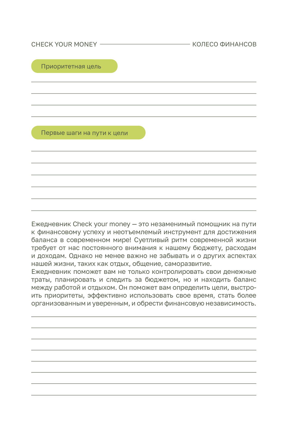 Ежедневник для тех, кто стремится обрести финансовую свободу и стабильность. Отслеживайте свои доходы и расходы, управляйте бюджетом и контролируйте затраты. Check your money поможет шаг за шагом разобраться в своих финансовых привычках, наладить отношение с деньгами, спланировать новые возможности инвестиций и накоплений.