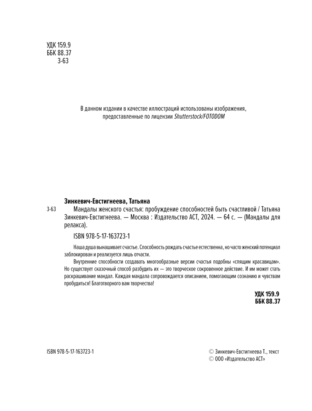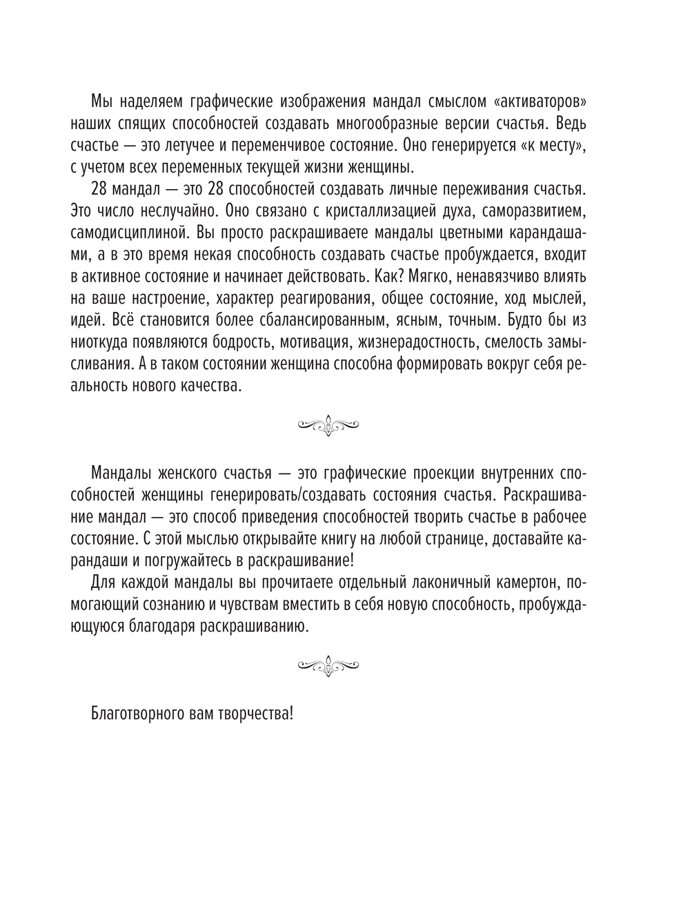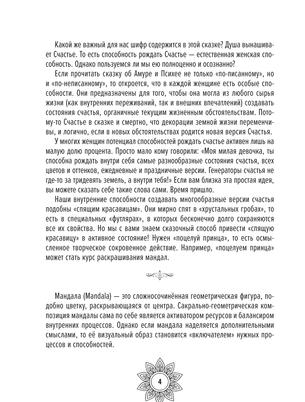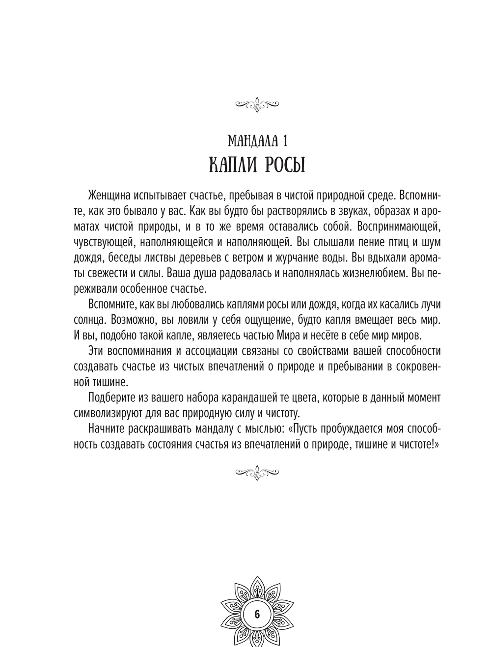 Внутренние способности создавать многообразные версии счастья подобны "спящим красавицам". Но существует сказочный способ разбудить их – это творческое сокровенное действие. И им может стать раскрашивание мандал. Каждая мандала сопровождается описанием, помогающим сознанию и чувствам пробудиться! Благотворного вам творчества!