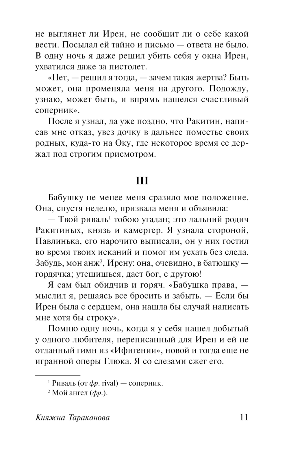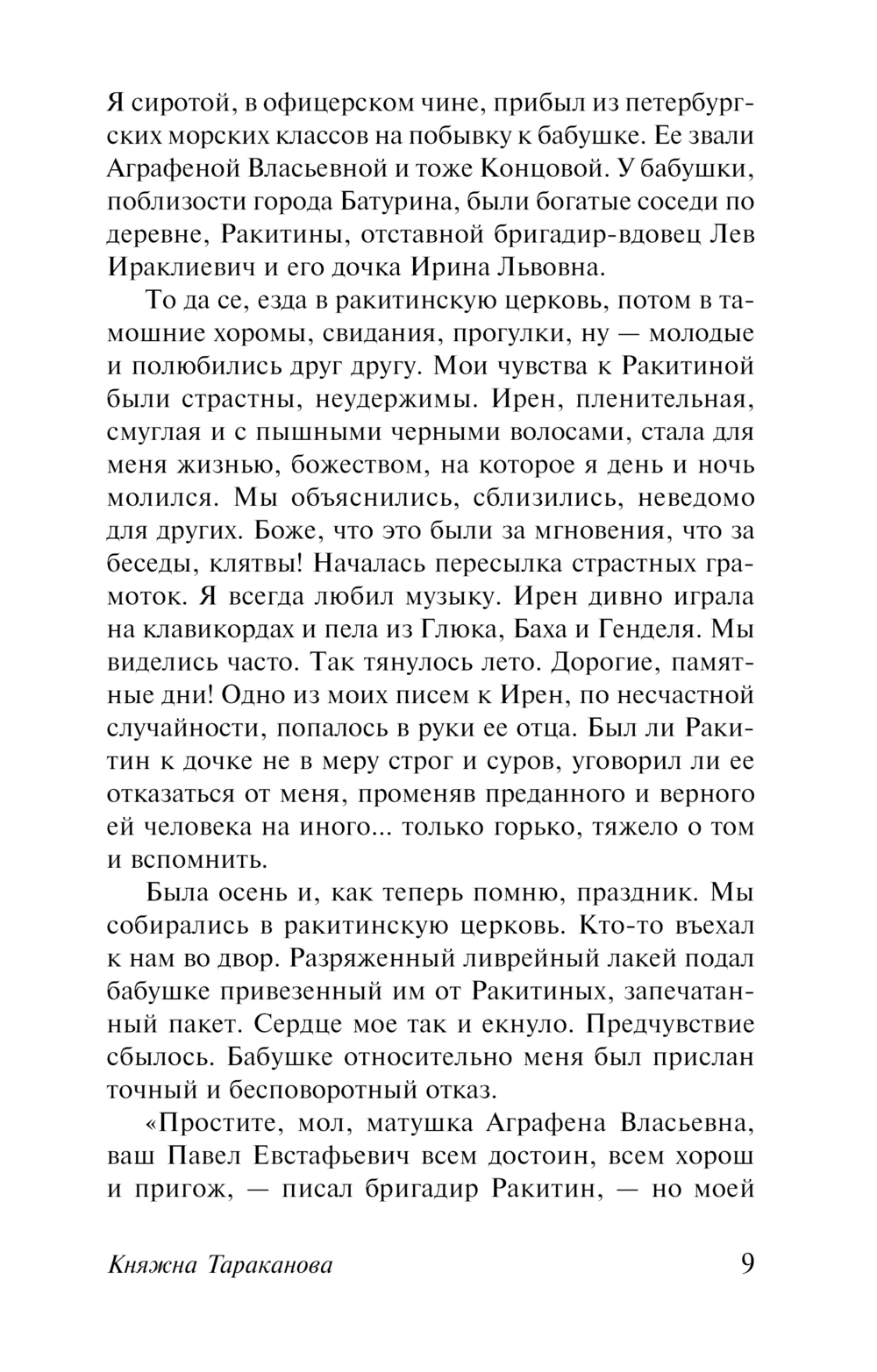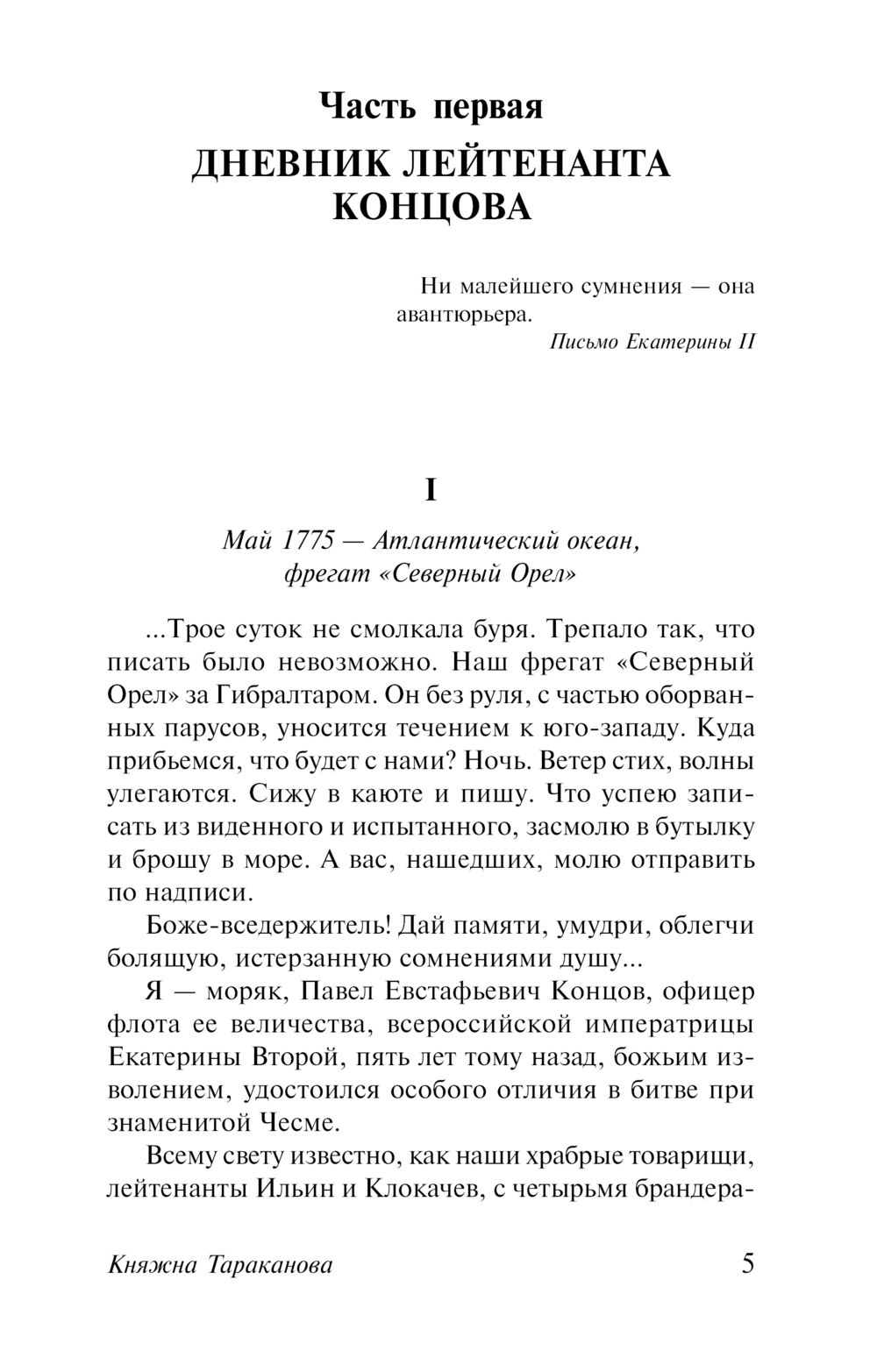 Действие романа "Княжна Тараканова" начинается зимой 1775 года. В Европе появляется молодая аристократка, назвавшая себя дочерью императрицы Елизаветы от ее тайного брака с фаворитом Алексеем Разумовским. Княжна Тараканова заявляет о своих правах на российский престол и пытается заручиться поддержкой европейских монархов и влиятельных русских дворян, в том числе могущественного графа Орлова. Княжна и не подозревает, что государыня Екатерина уже велела верному ей графу изловить "авантюрьеру" и доставить в Петербург.